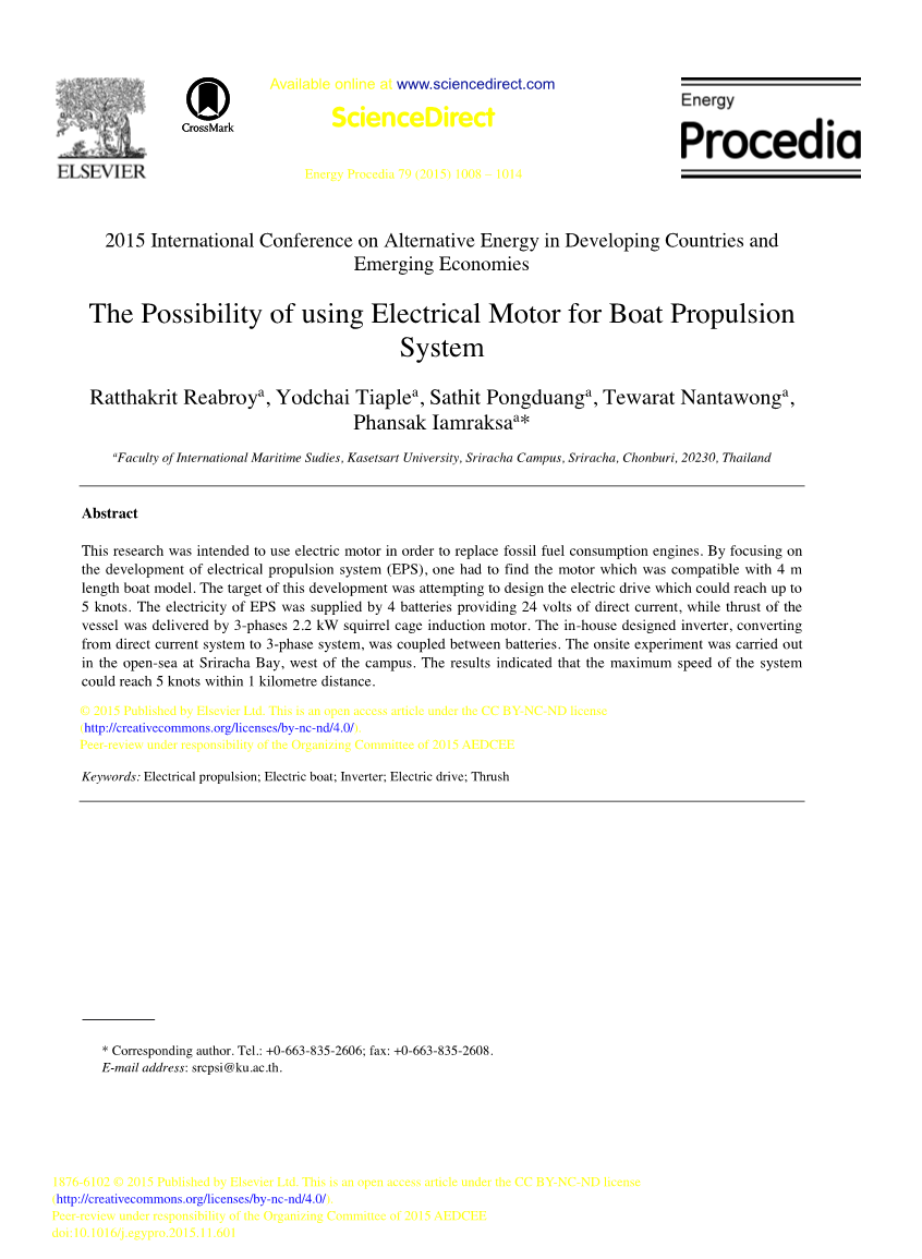 不同的小组开发了几次将普通的船外发动机替换为电动机的尝试 [1-3]。对市场上可用的普通电动机, 如永久同步电机、鼠笼式异步电动机和直流电机进行了测试和报告 [1-3]。与柴油发动机或汽油发动机不同, 与相同尺寸的发动机相比, 电机的功率输出较小, 因此电力推进的性能受到限制;这可能意味着, 如果用户想获得与汽油相同的驱动功率, 就需要更大的电机。由于电机较大导致更大的重量影响性能, 外置电动发动机的尺寸成为主要障碍之一;然而, 不同的船舶设计导致轻微的改进, 例如双体船可以比单壳船更好地执行时, 当它使用电力推进系统 [2-3] 另一方面, 轻材料也可以取代传统的, 以减轻重量。