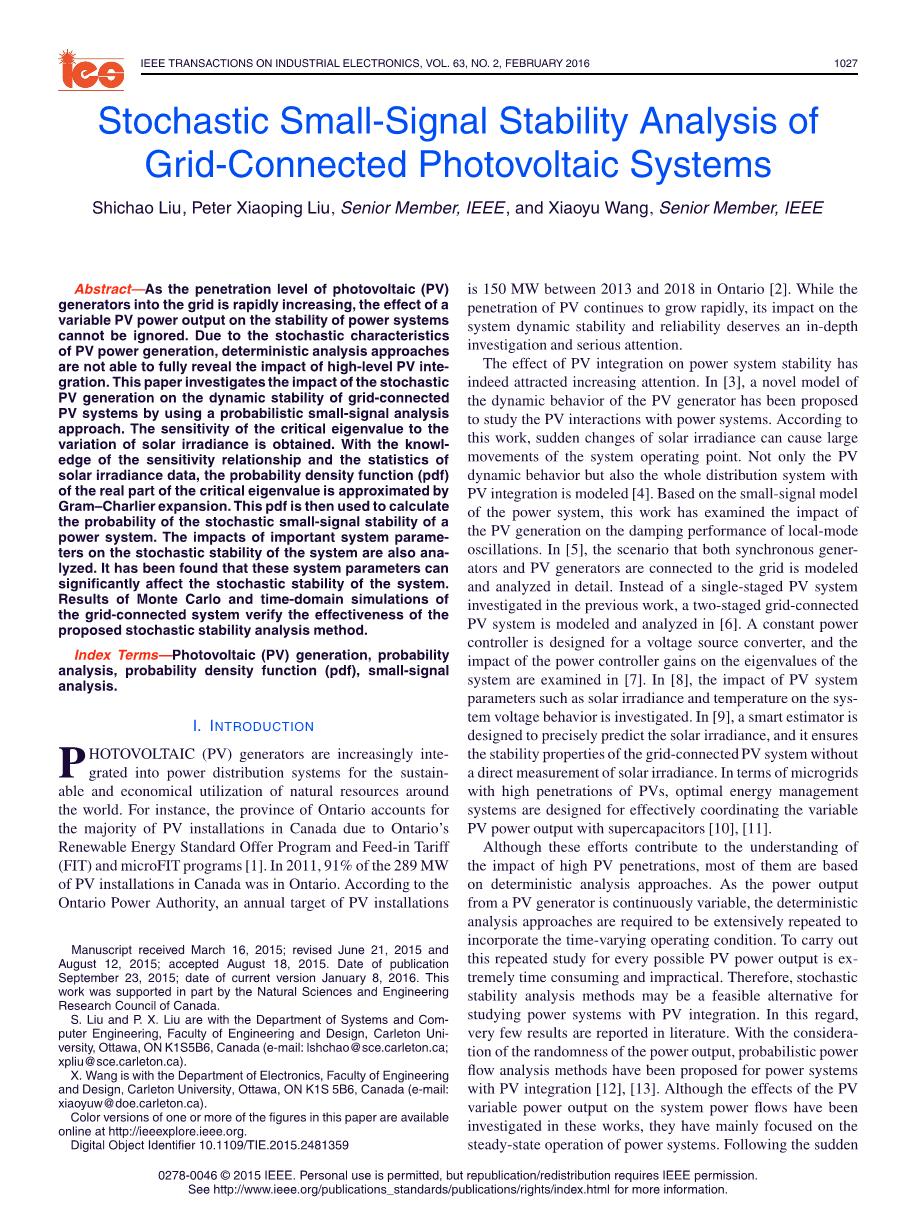 摘要-随着光伏(PV)发电机并网的渗透率迅速增加,变化的光伏功率的输出对电力系统稳定性的影响不容忽视。由于光伏发电的随机特性,确定性分析方法无法充分揭示高度光伏集成的影响。本文利用概率小信号分析方法研究了随机光伏发电对并网光伏系统动态稳定性的影响。获得了临界特征值对太阳辐照度变化的灵敏度。利用灵敏度关系的知识和太阳辐照度数据的统计,临界特征值实部的概率密度函数(pdf)通过Gram-Charlier展开来近似。然后,该pdf用于计算电力系统的随机小信号稳定性的概率。分析了重要系统参数对系统随机稳定性的影响。已经发现,这些系统参数可以显著影响系统的随机稳定性。蒙特卡罗的结果和并网系统的时域仿真验证了所提出的随机稳定性分析方法的有效性。