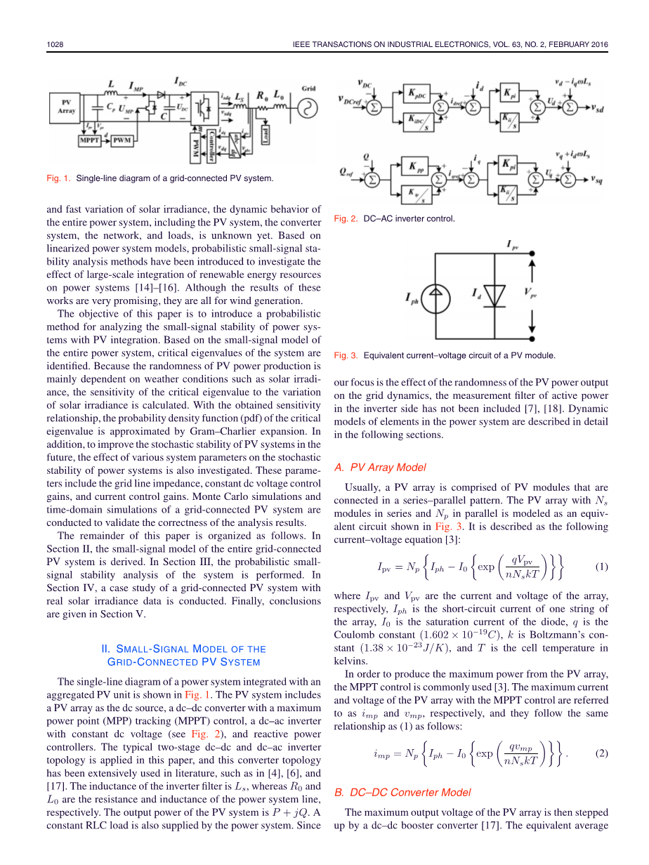 虽然这些努力有助于理解高PV计入量的影响,但大多数都是基于确定性分析方法。由于PV发电机的功率输出是连续可变的,因此是确定性的需要广泛重复分析方法以结合时变操作条件。对每个可能的PV功率输出进行这种重复研究是非常耗时且不切实际的。因此,随机稳定性分析方法可能是研究光伏集成电力系统的可行方案。在这方面,文献报道的结果很少。考虑到功率输出的随机性,已经提出了具有PV集成的电力系统的概率潮流分析方法[12],[13]。尽管在这些工作中已经研究了PV变化的功率输出对系统功率流的影响,但它们主要集中在电力系统的稳态运行上。在太阳辐照度突然和快速变化之后,整个电力系统的动态行为,包括光伏系统,变换器系统,电网和负荷尚未得知。基于线性化电力系统模型,引入概率小信号稳定性分析方法来研究可再生能源资源大规模并网对电力系统的影响[14]- [16]。虽然这些工作成果非常有运用前景,但它们都是用于风力发电的。本文的目的是介绍一种利用光伏集成分析电力系统小信号稳定性的概率方法。基于整个电力系统的小信号模型,识别系统的关键特征值。由于光伏发电的随机性主要取决于太阳辐照度等天气条件,因此计算了临界特征值对太阳辐照度变化的灵敏度。利用所获得的灵敏度关系,临界特征值的概率密度函数(pdf)通过Gram-Charlier展开来近似。此外,为了提高光伏系统的随机稳定性,还研究了各种系统参数对电力系统随机稳定性的影响。这些参数包括电网线阻抗,恒定直流电压控制增益和电流控制增益。进行蒙特卡罗模拟和并网光伏系统的时域仿真,以验证分析结果的正确性。本文的其余部分安排如下。在第二节中,推导出整个并网光伏系统的小信号模型。在第三节中,执行系统的概率小信号稳定性分析。在第四节中,进行了具有真实太阳辐照度数据的并网光伏系统的案例研究。最后,第五节给出了结论。