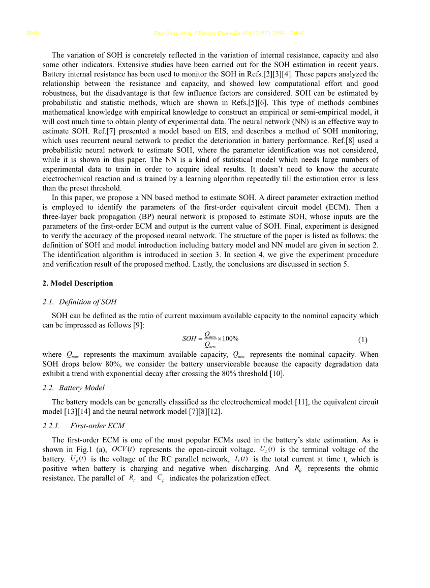 在本文中,我们提出了一种基于神经网络的方法来估算SOH。采用直接参数提取方法来识别一阶等效电路模型(ECM)的参数。然后提出了一个三层反向传播(BP)神经网络来估计SOH,其输入是一阶ECM的参数,输出是SOH的当前值。最后,实验旨在验证所提出的神经网络的准确性。本文的结构如下:在第2节中给出SOH的定义和模型介绍,包括电池模型和NN模型。识别算法在第3节中介绍。在第4节中,我们给出了所提方法的实验程序和验证结果。最后,在第5节中讨论结论。