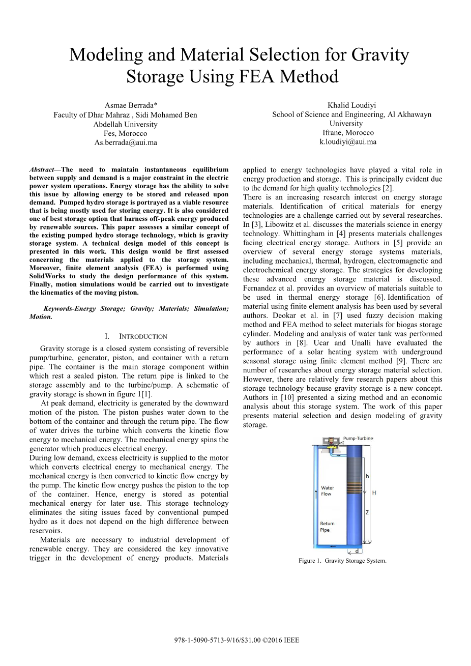 摘要:维持瞬时供需的均衡是电力系统运行的主要制约因素。储能通过能量按需储存和释放来解决这个问题。抽水储能被描述为一种主要用于储能的可行资源。它也被认为是利用可再生能源产生的非高峰能源的最佳储存方式之一。本文评估了现有抽水蓄能技术的类似概念,即重力存储系统。本文提出了这一概念的技术设计模型。首先评估该设计涉及应用于存储系统的材料。此外,使用SolidWorks进行有限元分析(FEA)以研究该系统的设计性能。最后,进行了运动仿真以研究移动活塞的运动学特性。