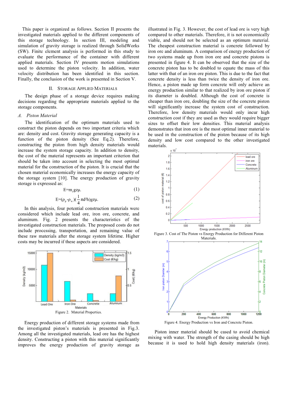 用于制造活塞的最佳材料取决于两个重要标准:密度和成本。重力储存发电量是活塞密度的函数(见等式2)。因此,用高密度材料制作活塞,可以提高系统的存储容量。除了密度外,材料成本也是选择活塞结构最佳材料时应考虑的重要标准。选择的材料在经济上增加存储系统的能量容量是至关重要的[10]。重力储存产生的能量表示为: