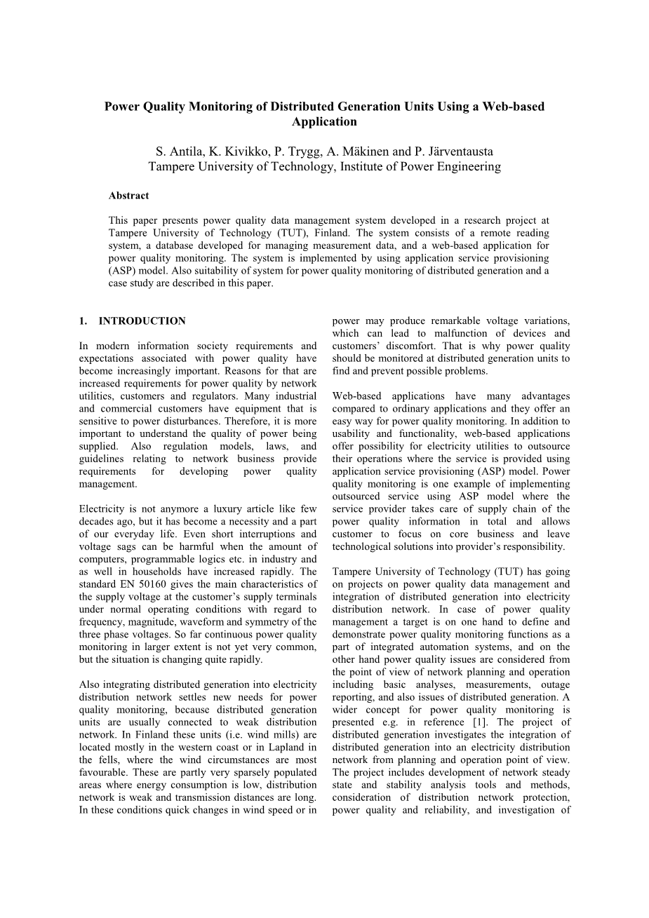 摘要:本文介绍了芬兰坦佩雷理工大学(TUT)研究项目开发的电能质量数据管理系统。该系统包括远程读取系统,为管理测量数据而开发的数据库,以及用于电能质量监测的基于Web的应用程序。该系统通过使用应用程序服务供应(ASP)模型实现。本文还介绍了该系统对分布式发电电能质量监测的适用性和案例研究。