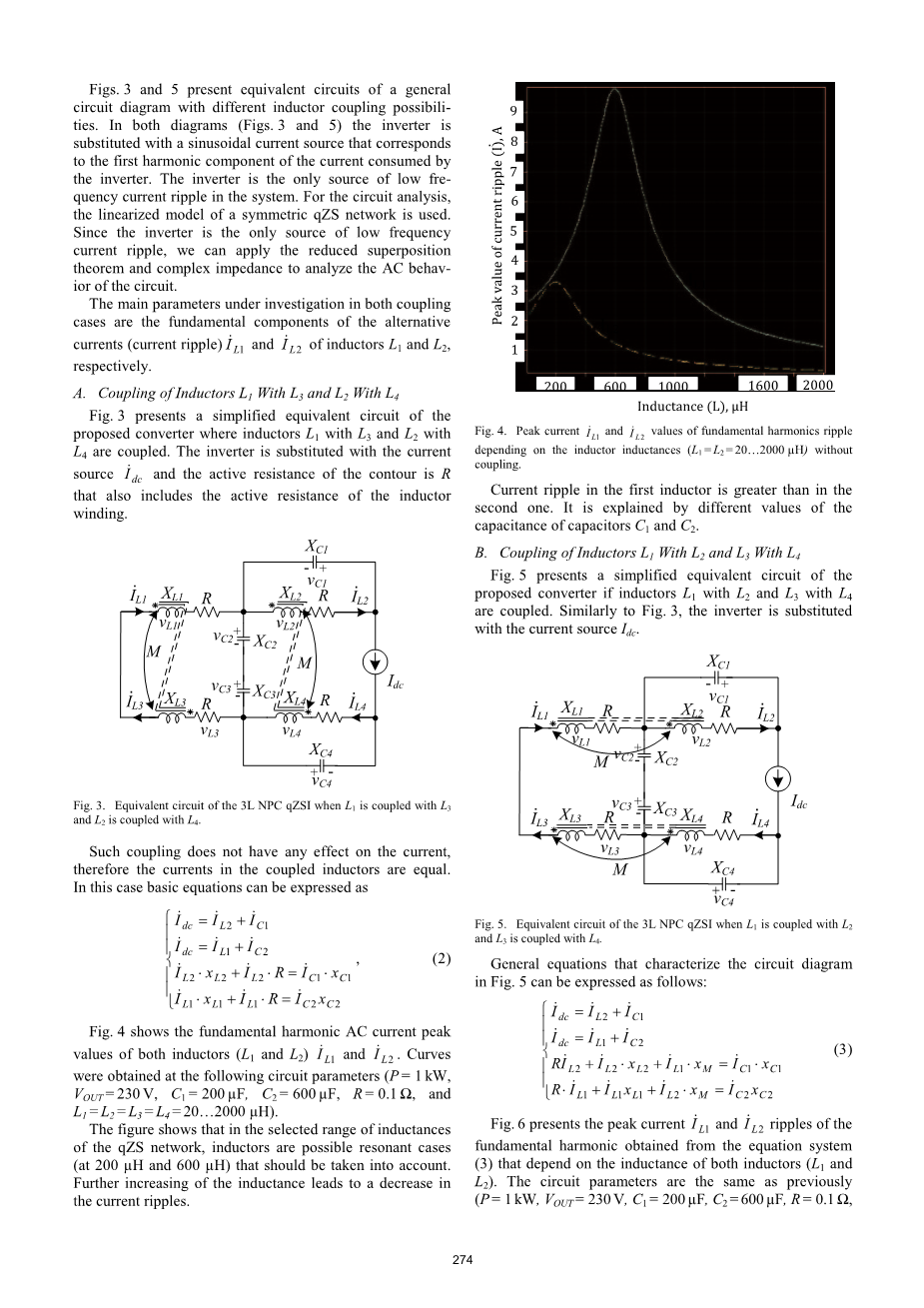 图3和5示出了一般的等效电路电路图与不同的电感耦合可能性。在两个图中(图3和5),逆变器是用对应的正弦电流源代替消耗的电流的一次谐波分量逆变器。 逆变器是系统中唯一的低频电流纹波源.对于电路分析,使用对称qZS网络的线性化模型。由于逆变器是低频的唯一来源电流纹波,我们可以应用减少的叠加定理和复阻抗分析电路的AC行为。在两种耦合情况下研究的主要参数分别是电感器L1和L2的交流电流(电流纹波)L1和L2的基本分量。