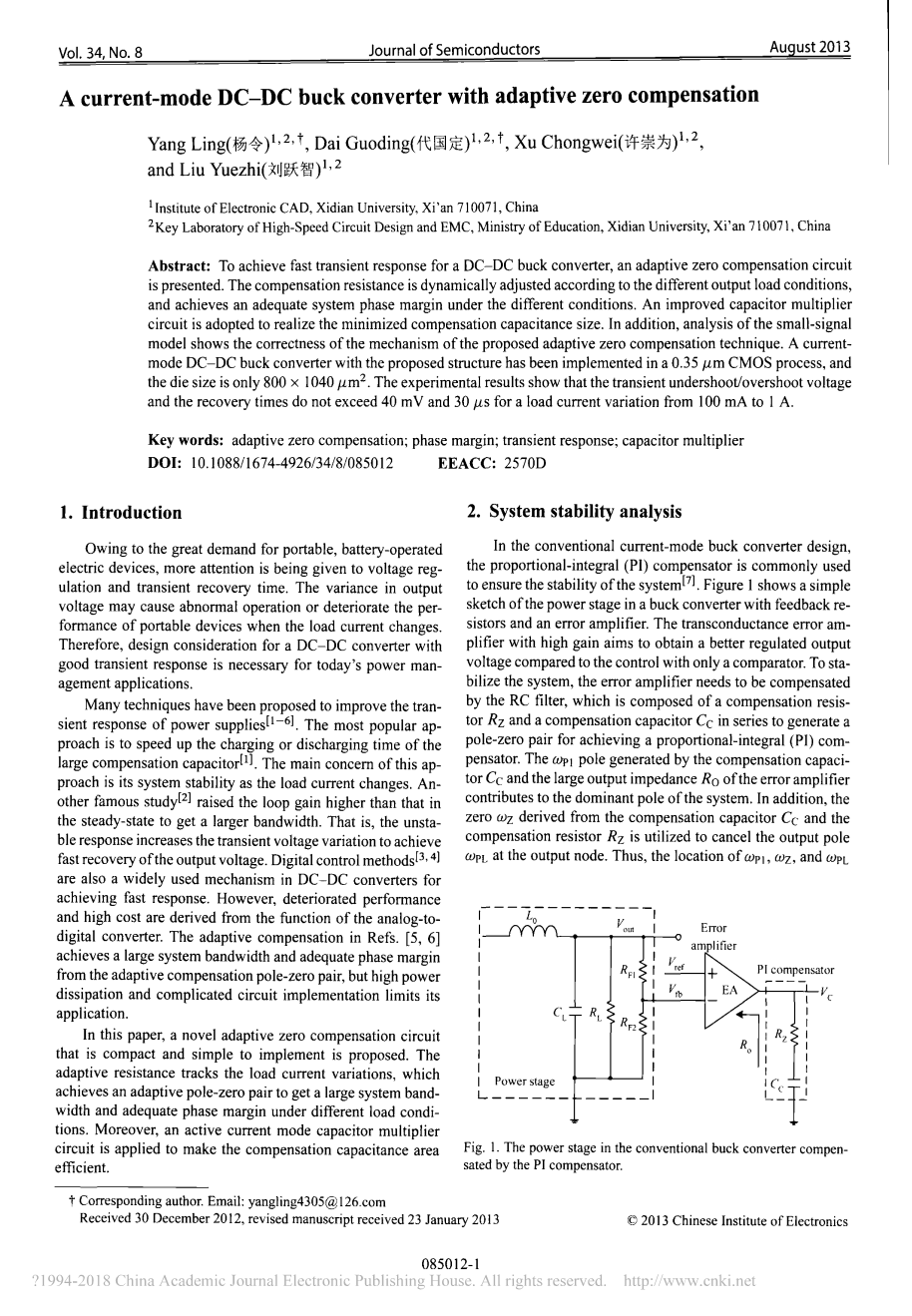 针对电流型DC-DC降压变换器在不同负载条件下的快速瞬态响应,提出了一种自适应零补偿电路。利用跟踪负载电流变化的补偿电阻实现自适应极点零对,在不同负载条件下获得较大的系统带宽和足够的相位裕度。通过电容乘法器电路的实现,该电路结构紧凑,实现简单。对小信号模型的分析表明了所提出的自适应零补偿技术机理的正确性。实验结果表明,该电路可用于便携式DC-DC变换器中。