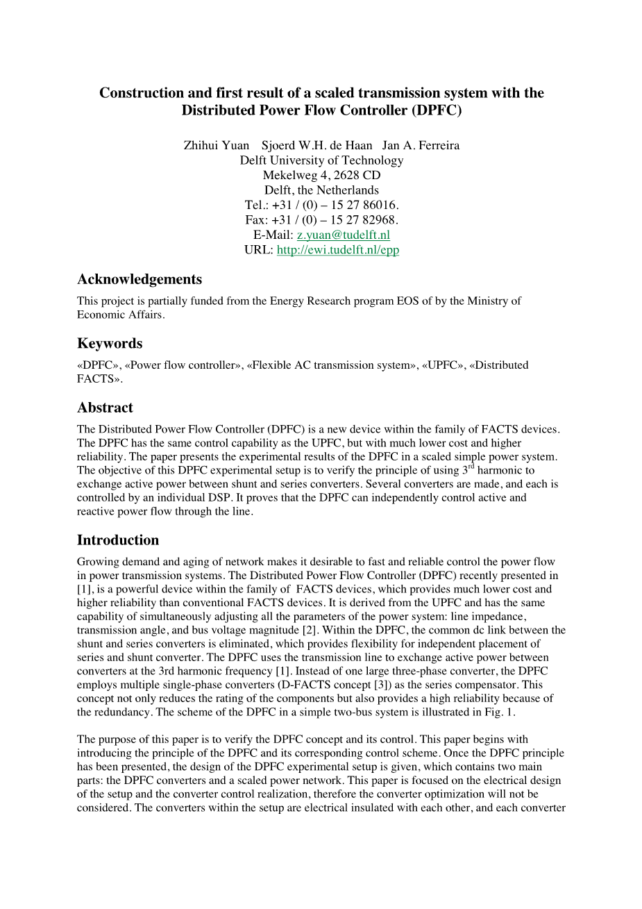 本文的目的是验证DPFC的概念及其控制。本文首先介绍了DPFC的原理及其相应的控制方案。在介绍了DPFC原理后,给出了DPFC实验装置的设计,实验装置主要包括两个部分:DPFC变流器和一个规模化电网。本文重点介绍了设置的电气设计和变流器控制的实现,因此不考虑变流器的优化。设置中的变流器彼此电绝缘,并且每个变流器由其自己的DSP处理器控制。在本文的最后部分,介绍了DPFC实验装置的第一个结果。