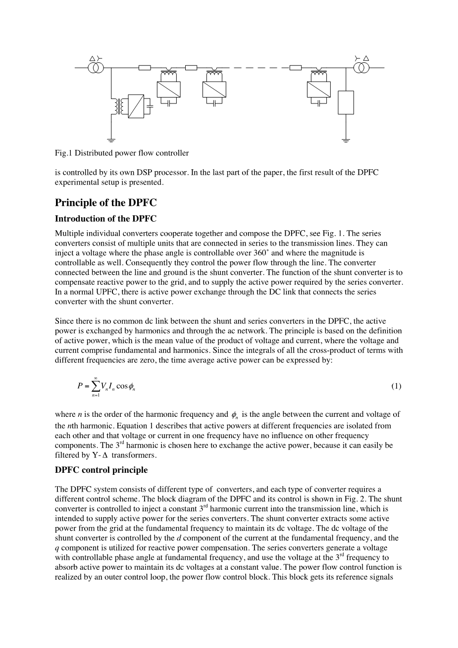 随着网络需求的增加和网络的老化,有必要对输电系统的潮流进行快速、可靠的控制。最近在[1]中提出的分布式潮流控制器(DPFC)是FACTS设备系列中的一种功能强大的设备,与传统的FACTS设备相比,它具有更低的成本和更高的可靠性。它是由UPFC派生而来,具有同时调整电力系统所有参数的能力:线路阻抗、传输角、母线电压大小[2]。在DPFC内,串并联侧变流器之间的公共直流链路被消除,这为串联侧和并联侧变流器的独立放置提供了灵活性。 DPFC使用传输线在三次谐波频率下于变流器之间交换有功功率[1]。 DPFC使用多个单相变换器(D-FACTS概念[3])作为串联补偿器,而不是一个大型三相变换器。该概念不仅降低了组件的额定值,而且由于冗余而提供了高可靠性。简单的双总线系统中的DPFC方案如图1所示。