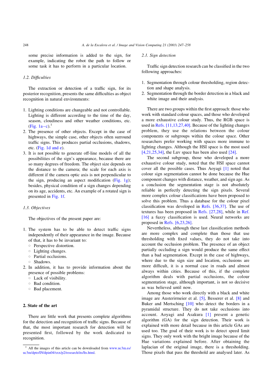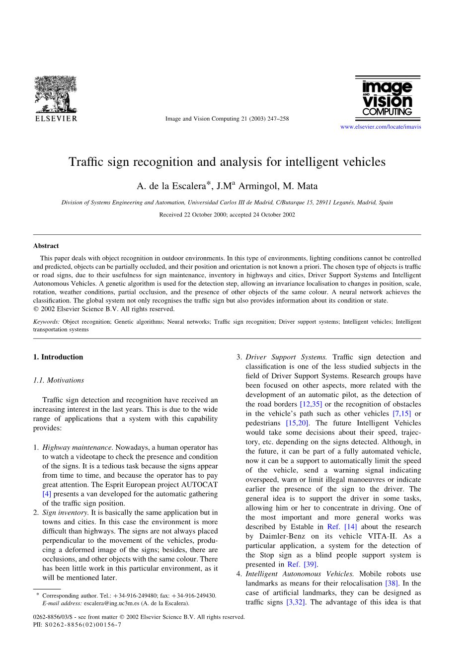 3.驱动程序支持系统。交通标志探测及分类是目前国内外研究较少的学科之一驱动支持系统领域。研究组织被集中在其他方面,大多与自动导航,作为检测道路的边界[12,35]或障碍的承认在车辆的路径上,如其他车辆[7,15]或行人[15 20]相关。根据探测到的信号来判断,未来智能汽车特拉杰克,将决定他们的速度。尽管如此,在未来,它可以成为全自动交通工具的一部分,现在它可以支持自动限制速度的车辆,发出警告信号指示超速、警告或限制非法操纵或指示早些时候出现的司机的标志。一般的想法是在一些任务中支持驱动程序,让他或她专心开车。最重要和更一般的任务之一是Estable在参考文献[14]中对该研究进行了描述由戴姆勒-奔驰在其车辆VITA-II。作为一个特殊应用,一种用于检测的系统停车标志作为盲人辅助系统,见文献[39]。