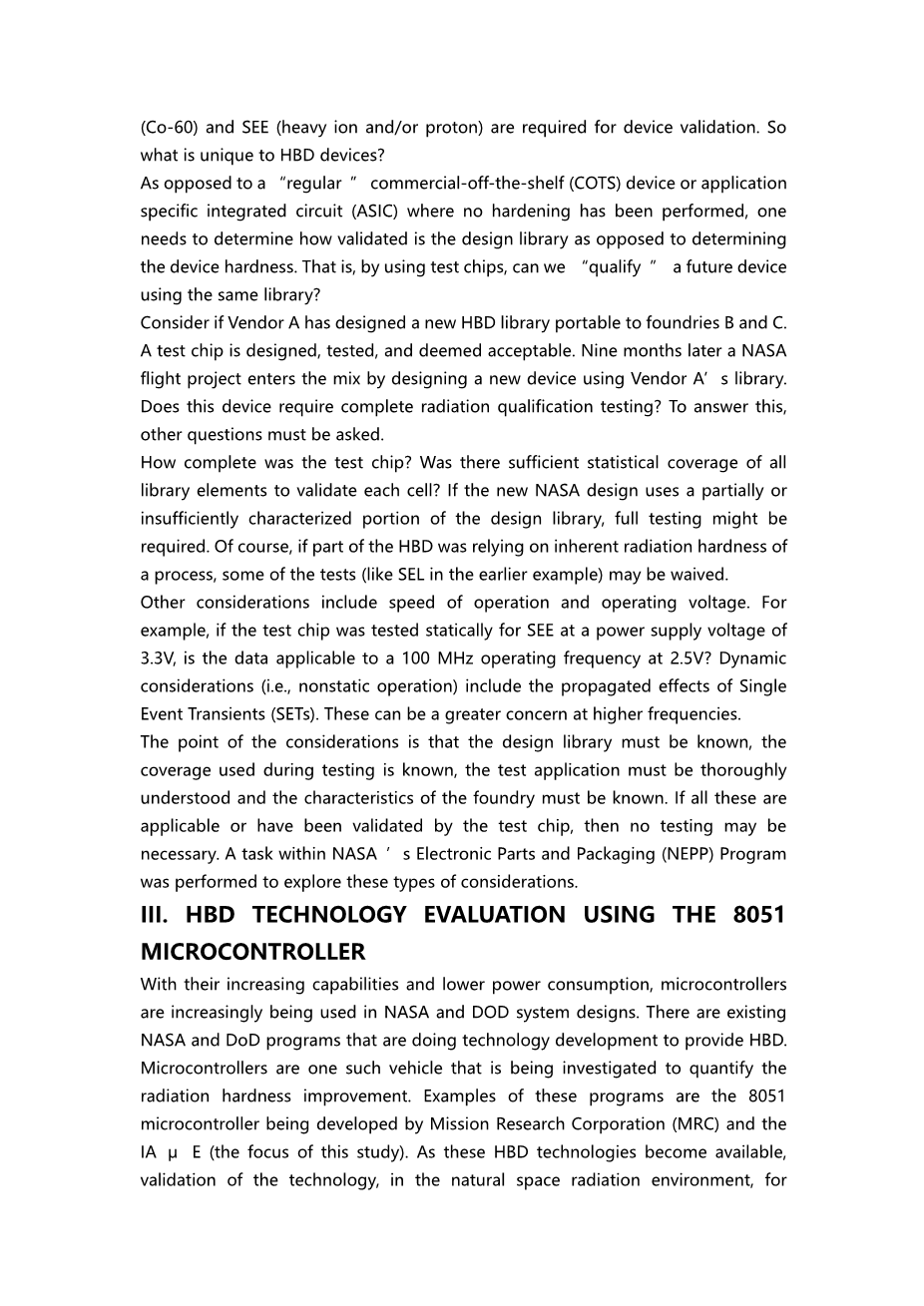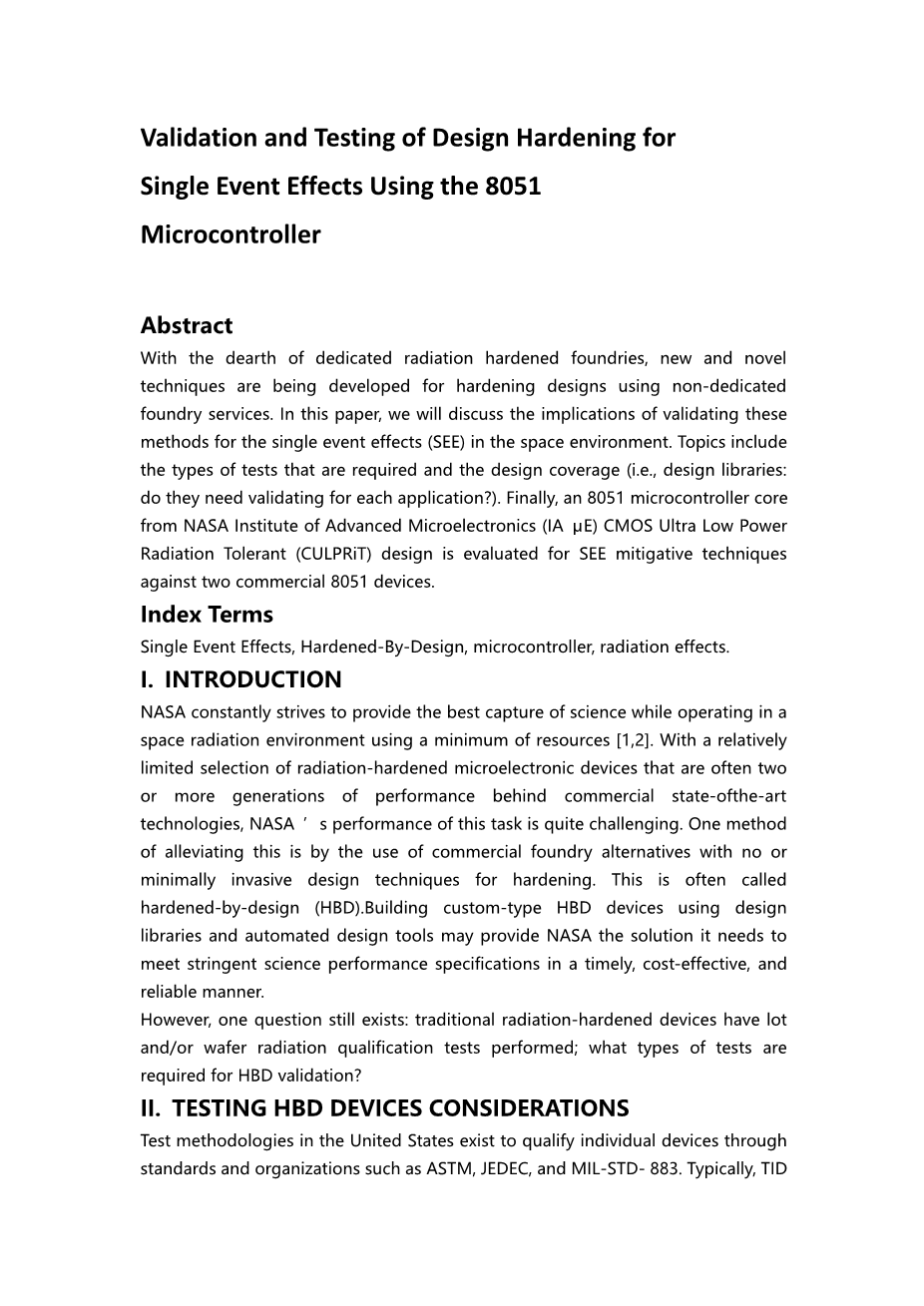 随着专用抗辐射加固工艺的代工业务的减少,使用非专用代工业务的新技术逐步发展起来。在这篇论文中,我们将在空间环境中讨论单粒子效应(SEE)的验证方法。课题包括需要测试的类型和设计覆盖面(他们是否需爱验证设计库的每个应用程序)。文章所提到的8051单片机核心是根据美国航天局的高级微电子研究所(IAmu;E)的CMOS超低功耗辐射容错技术(CULPRIT)设计的。它是评价两个8051工业用设备单粒子效应缓和技术的一项设计。
