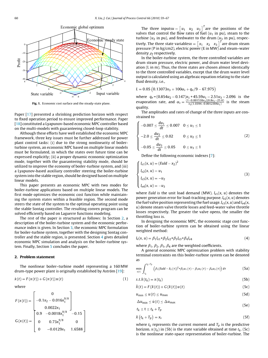 目前,电厂运行的主要问题已从单纯的跟踪控制问题转变为经济和环境问题。除了实现负荷跟踪外,发电厂还应更多地关注其他目标,如燃油消耗最小化、工作寿命最大化、污染物排放最小化等[7]。提高火力发电厂经济性的一般方法是将其管理和优化分解为两个层次[8,9]。第一个层次通常被称为实时优化(RTO),它决定了经济最优的操作设定点。第二级是由多变量控制系统(MPCS)决定适当的控制动作,使系统达到所需的稳态运行状态。这种分级控制的一个缺点是它忽略了动态过程的经济性。图1给出了一个简单直观的解释,显示了与一个状态变量和一个输入变量相关的经济成本面。监管MPC可以直接达到稳定状态的最优值,而不是全球经济最优值,因为该控制器不知道高利润状态[10]。
