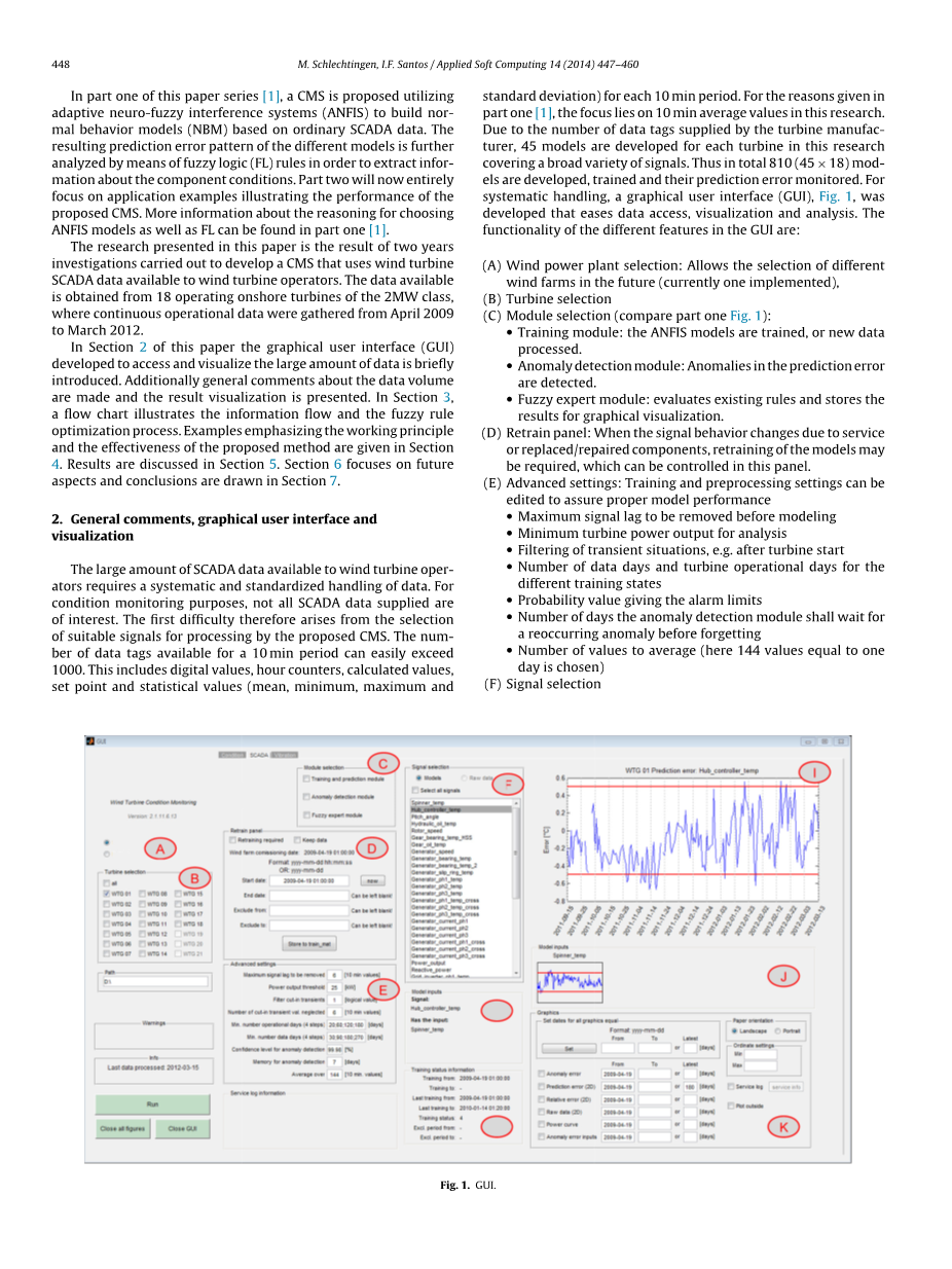 本文第2节描述了所开发系统的一般概念,详细说明了如何处理信息(SCADA数据)以最终输出条件语句。第3节简要说明了在给定应用中,ANFIS模型相对于NN模型的优势,并简要说明了所使用的模型设置和结构。第4节重点介绍已开发的正常行为模型的性能,并描述已识别的输入-输出集。第5节给出了预测误差分析和模型相互作用的示例。第6节给出了异常检测的概念,并给出了异常信号行为的定义。第7节阐述了作为模糊专家的模糊干扰系统(FIS)如何处理预测误差以及检测到的异常信息。输出是关于组件状况和异常的潜在根源的诊断。第8节讨论了结果,第9节给出了结论。