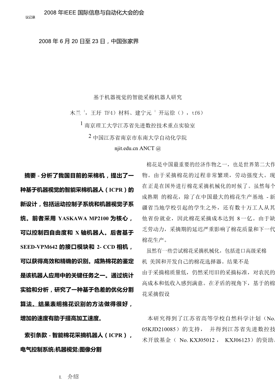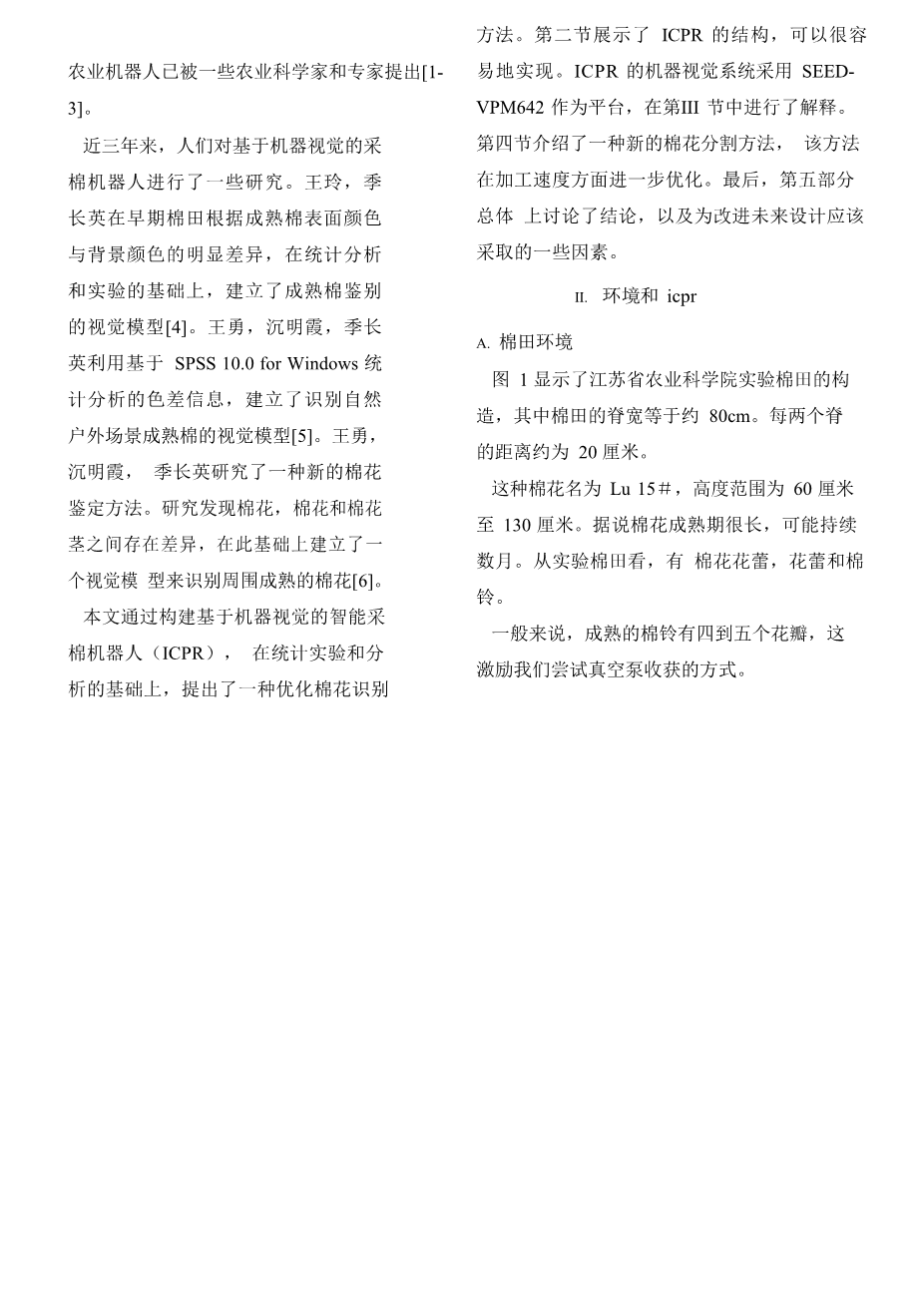 Some researches on cotton picking robot based on machine vision had been done in last three years. WANG Ling, JI Chang-ying established the visual model of discrimination of mature cotton according to the obvious difference between the surface color of mature cotton and background color in early cotton field, on the basis of the statistic analysis and experiments [4]. WANG Yong, SHEN Ming-xia, JI Chang- ying established the visual model that recognize the mature cotton in natural outdoor scenes by using the chromatic aberration information based on the statistical analysis with SPSS 10.0 for Windows [5]. WANG Yong, SHEN Ming-xia, JI Chang-ying studied a new method of cotton identification. The study found that there exist differences between cotton, cotton leaf and cotton stem, based on which a vision model was set up to identify ripe cotton from surroundings [6].