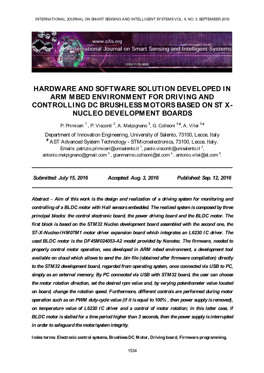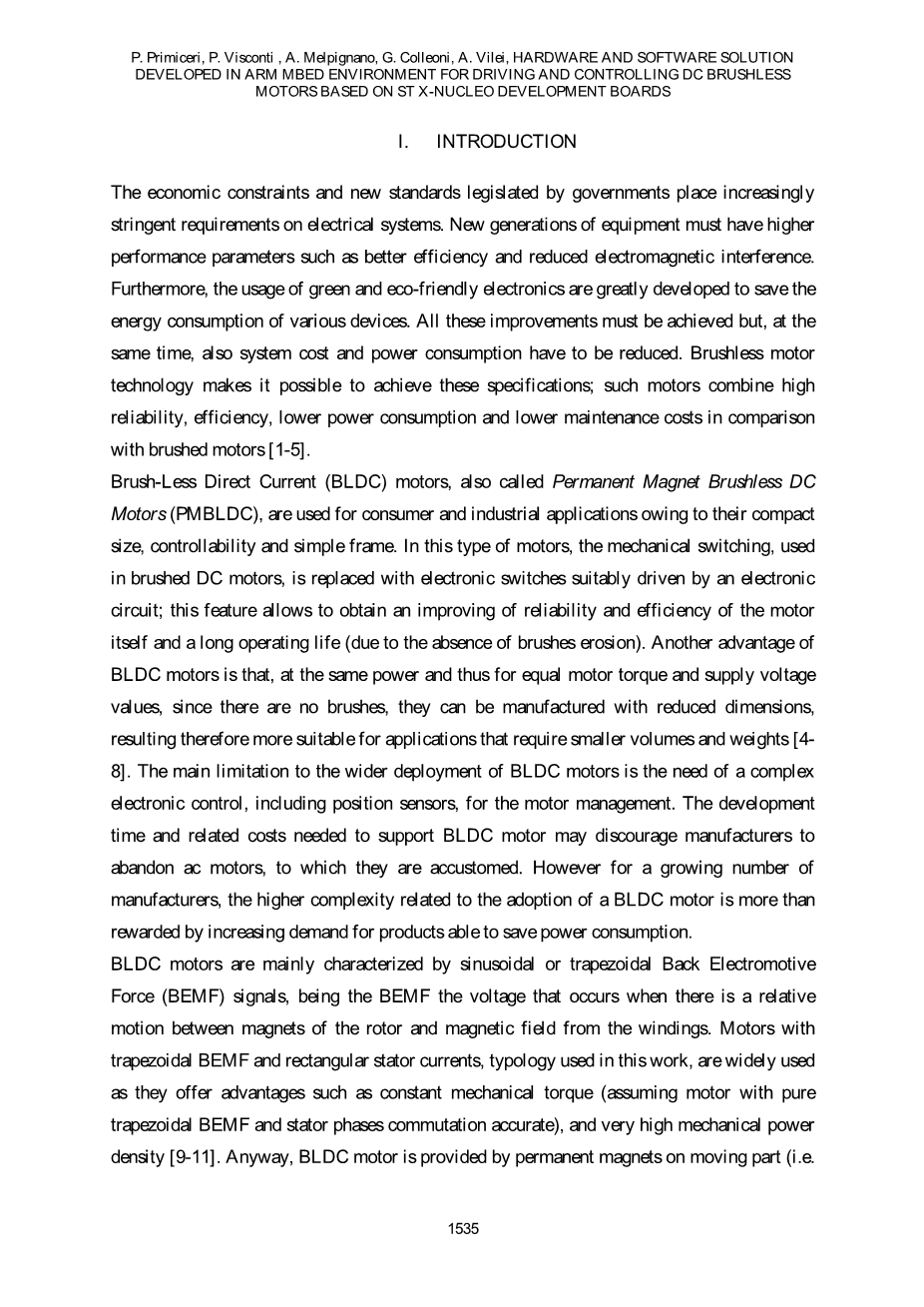 本工作的目的是设计和实现一种嵌入式霍尔传感器的无刷直流电动机驱动监控系统。所实现的系统由控制电子板、动力驱动板和无刷直流电机三个主要模块组成。第一个模块是基于STM32核心开发板与第二个模块(集成了L6230 IC驱动器的ST-X-Nucleo-IHM07M1电机驱动扩展板)组装而成。所使用的无刷直流电机为Nanotec提供的DF45M024053-A2型。固件,操作需要适当控制电动机,是在手臂mb开发环境,开发工具可以在云允许发送。bin文件(固件后获得编译)直接STM32开发板,从操作系统认为,一旦通过USB连接到电脑,只是作为外部内存。通过USB连接STM32板的PC机,用户可以选择电机的旋转方向,设置所需的rpm值,通过改变板上的电位计值,改变转速。此外,在电机运行过程中进行不同的控制,如PWM占空比值(如果等于100%,则断开电源)、L6230 IC驱动器温度值和电机旋转控制;在后一种情况下,如果无刷直流电动机失速超过3秒,则电源将被中断,以保护电机/系统的完整性。