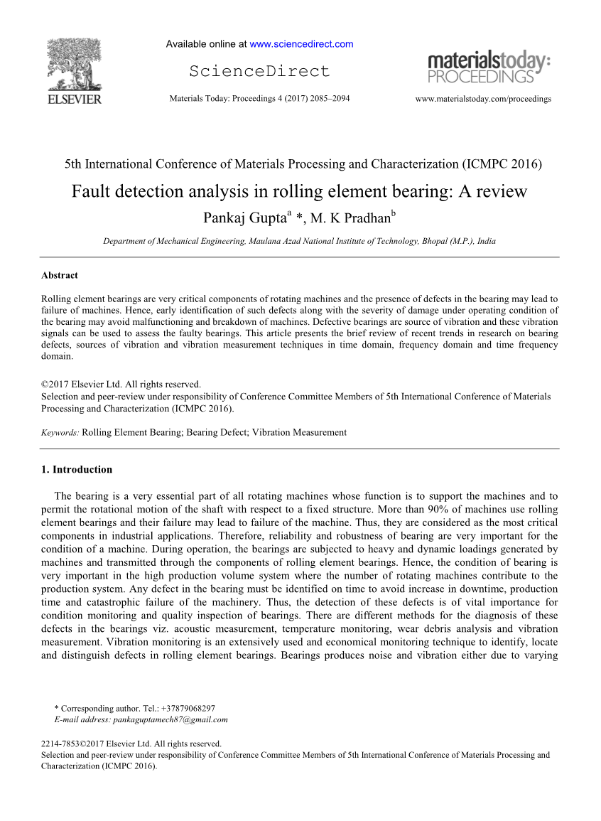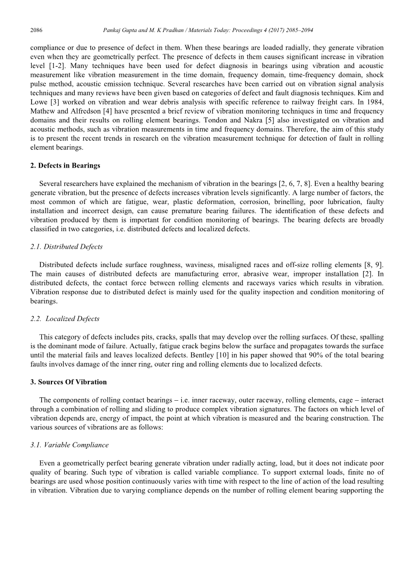 遵从或因其存在缺陷。当这些轴承被径向加载时,即使它们在几何上是完美的,它们也会产生振动。缺陷的存在导致振动水平的显著提高。利用振动和身测量技术进行周抽故障诊断技术有时域,频域,时频域,冲分析,冲击脉冲法。声发射技术等。对振动信号分析技术进行了大量的研究,斌从缺陷分类和故障诊断技术等方面进行了综述。Kim和Lowe从事振动和磨损碎片分析,并特别提到铁路货车。1984年,Mathew和Alfredson简要介绍了时域和频域振动监测技术及其在滚动轴承上的研究结果。Tondon和Nakral还研究了振动和声学方法,如时域和频域振动测量。因此,本研究的目的是介绍滚动轴承故障检测中振动测量技术的研究现状。