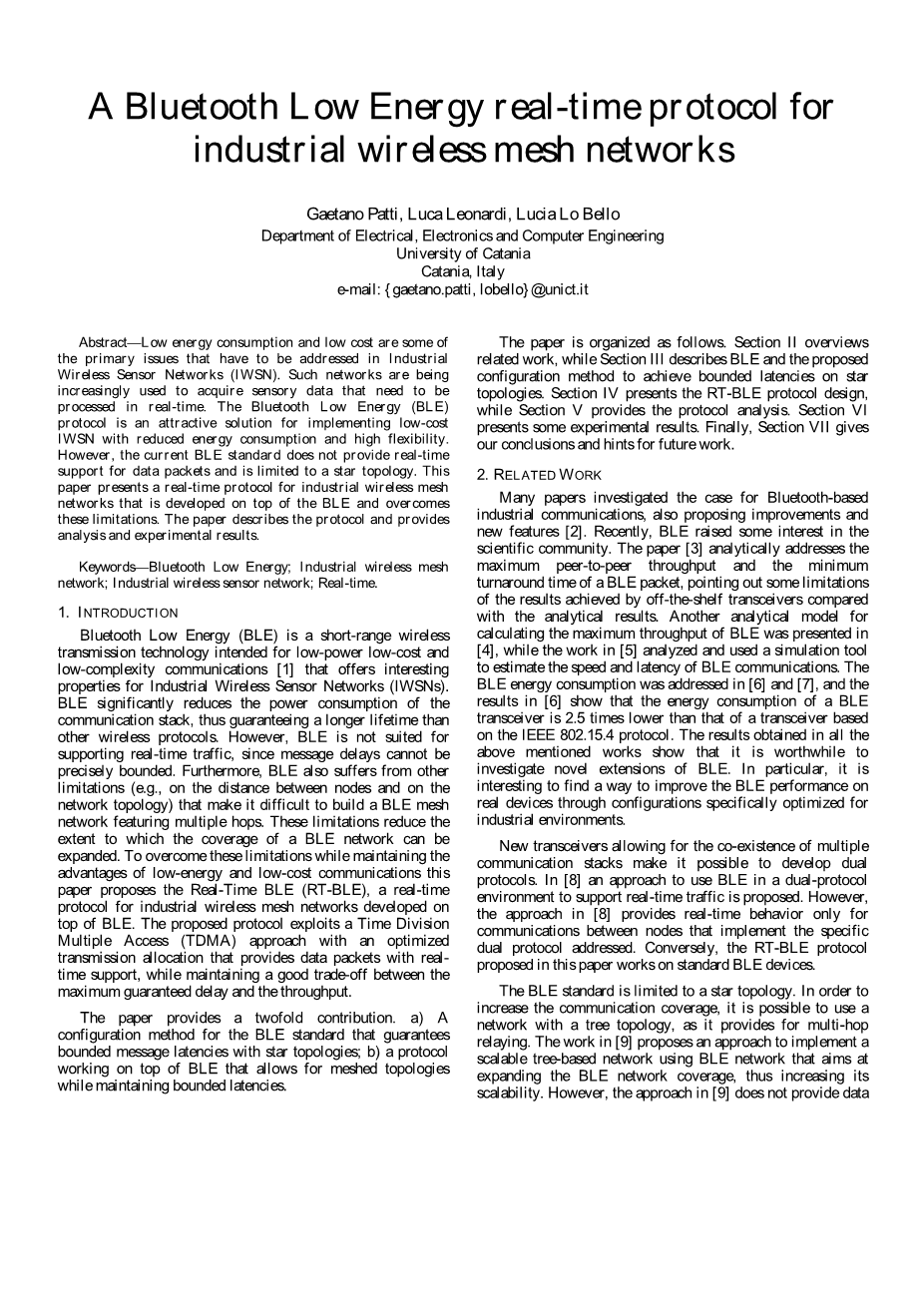 蓝牙低能耗(BLE)是一种用于低功耗、低成本和低复杂度通信的短程无线传输技术[1],为工业无线传感器网络(IWSNs)提供了有趣的特性。大大降低了通信堆栈的功耗,从而保证了比其他无线协议更长的寿命。然而,BLE不适合支持实时流量,因为消息延迟不能精确地被界定。此外,BLE还受到其他限制(例如节点之间的距离和网络拓扑),使得难以构建具有多跳的BLE网格网络。这些限制降低了BLE网络的覆盖范围可以扩大的程度。为了克服这些限制,同时保持低能量和低成本通信的优点,本文提出了实时BLE(RT-BLE),一种在BLE之上开发的工业无线网格网络的实时协议。该协议利用时分多址(TDMA)方法进行优化传输分配,为数据包提供实时支持,同时在最大保证延迟和吞吐量之间保持良好的权衡。