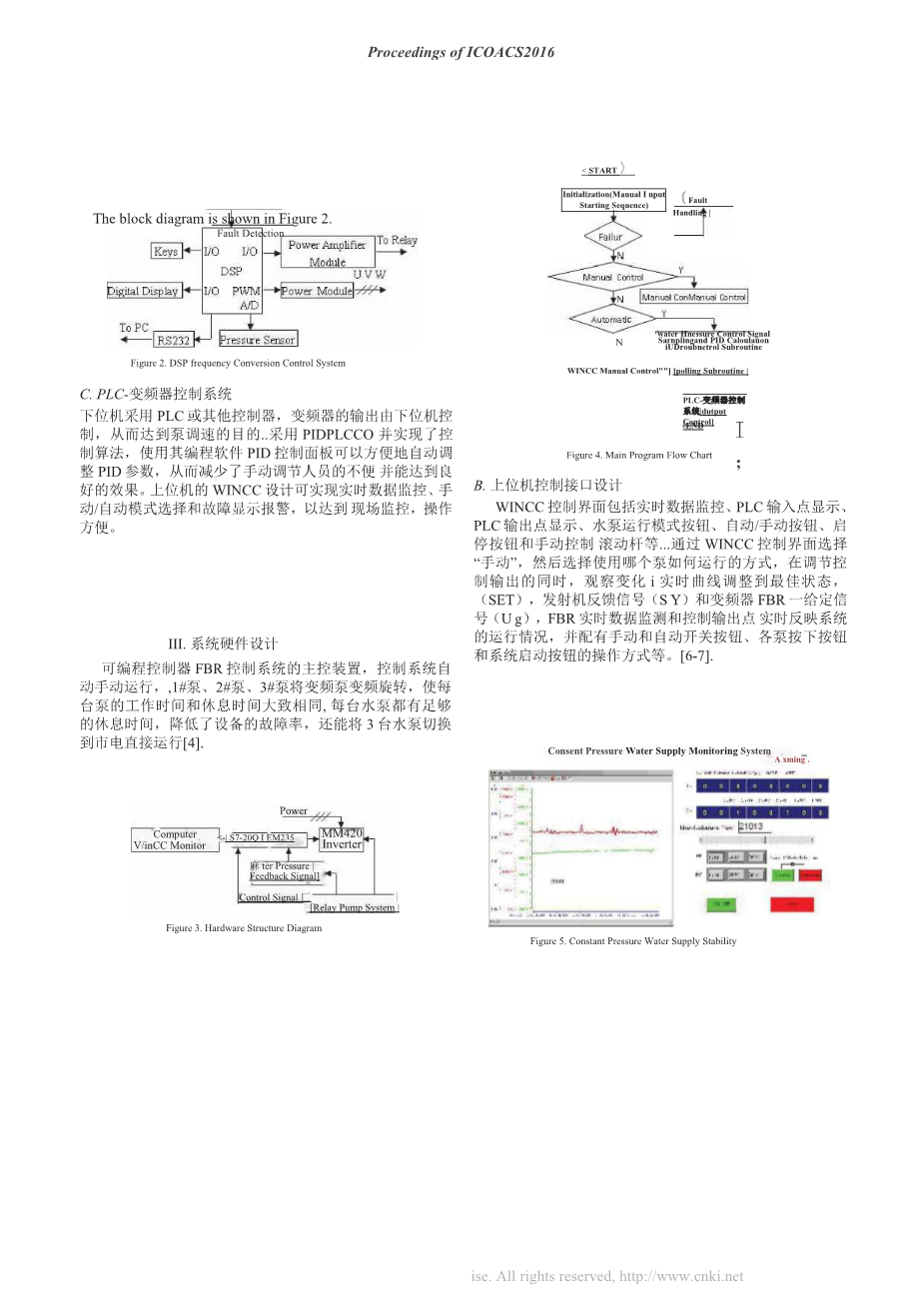 Abstract—The stability, reliability and economy of water supply system directly affect the normal work and life of the users, and it also reflects the management level of the water supply system. According to the energy saving principle of the frequency conversion and energy saving of water supply system, the design scheme of the automatic control system of the upper computer with PLC as the controller and the frequency converter is presented. From the hardware selection, circuit design, the lower computer control program, the upper computer monitor screen and so on to make a detailed demonstration and design. Through on-line debugging of the constant pressure water supply system, the system has the advantages of strong stability, reliability, operation convenience, good monitoring and so on.