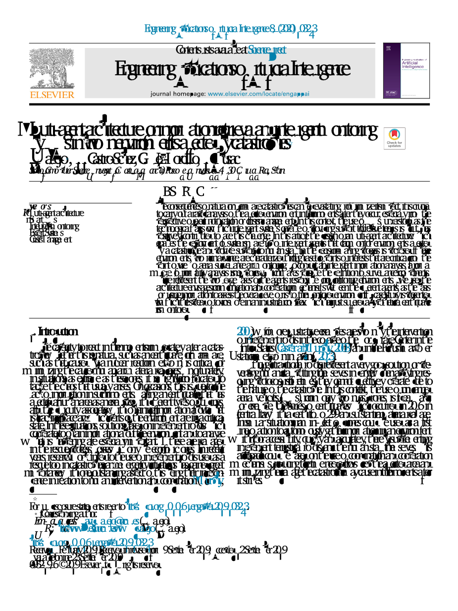 本文的其余部分结构如下。第2节主要介绍了国内外研究现状。第3节详细介绍了本文所讨论的多智能体体系结构,分析了其必要性和主要应用,重点介绍了所设计的不同软件智能体的作用以及集成通信与协作机制的定义。第4节展示了部署多智能体系统时要进行的主要步骤,并引入一个研究案例,即在一个震后的工业综合体及城市组成的场景中监测有毒烟雾的蔓延。在第5节中,定义了一个监视组件,其目的在于使用前面提到的正规分析的正规模型(Albusac等人,2009)监视有毒烟雾的蔓延。最后,第6节得出结论,并概述了未来的研究方向。