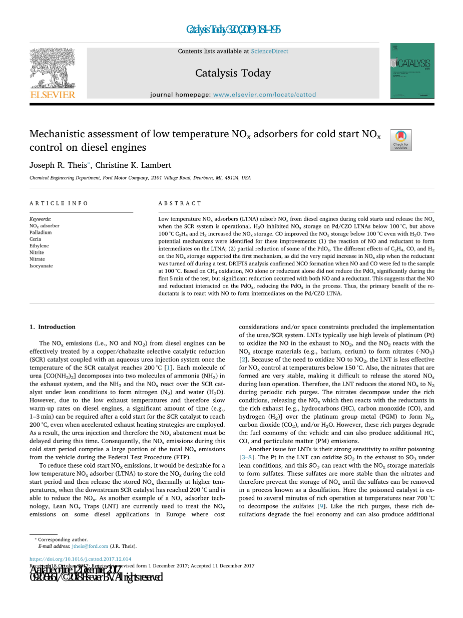 KeyWords: NOx adsorber; Palladium; Ceria; Ethylene; Nitrite; Nitrate; Isocyanate