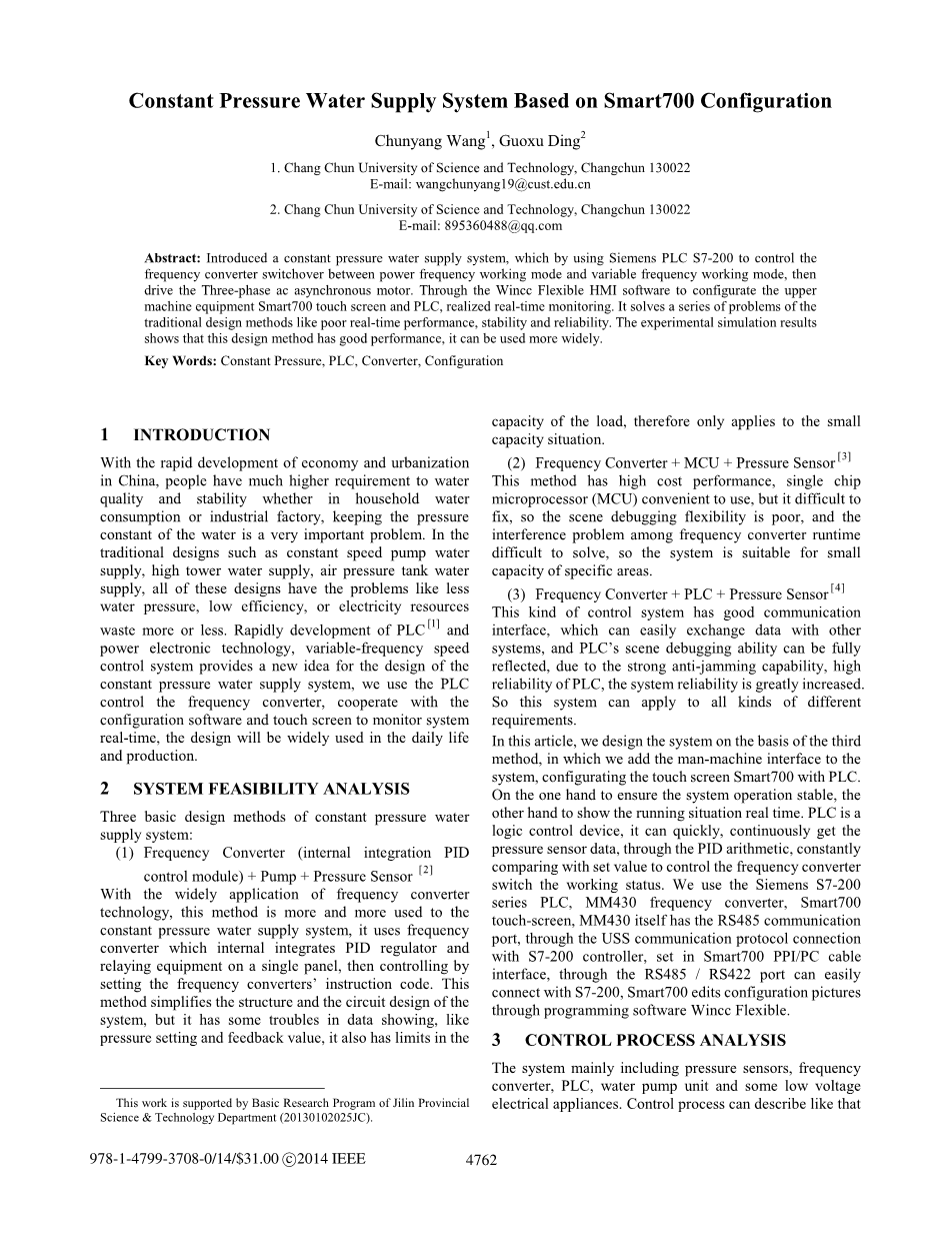 随着中国经济和城镇化快速发展,无论是在家庭水源消耗还是工业工厂方面人们对于水源的质量和稳定性有了更高的要求,保证水源的压力恒定是一个非常重要的问题。在传统的设计中,像恒速泵供水,高塔供水,气压罐供水,所有这些设计都或多或少有像水压太小,效率过低或者电能浪费这些问题。随着PLC和电力电子技术的快速发展,变频速度控制系统为恒压供水系统的设计提供了一个新的观点,我们用PLC控制频率转换器,同时在配置软件和触摸屏配合下实时监测系统,这个设计将会广泛的应用在日常生活和工业生产中。