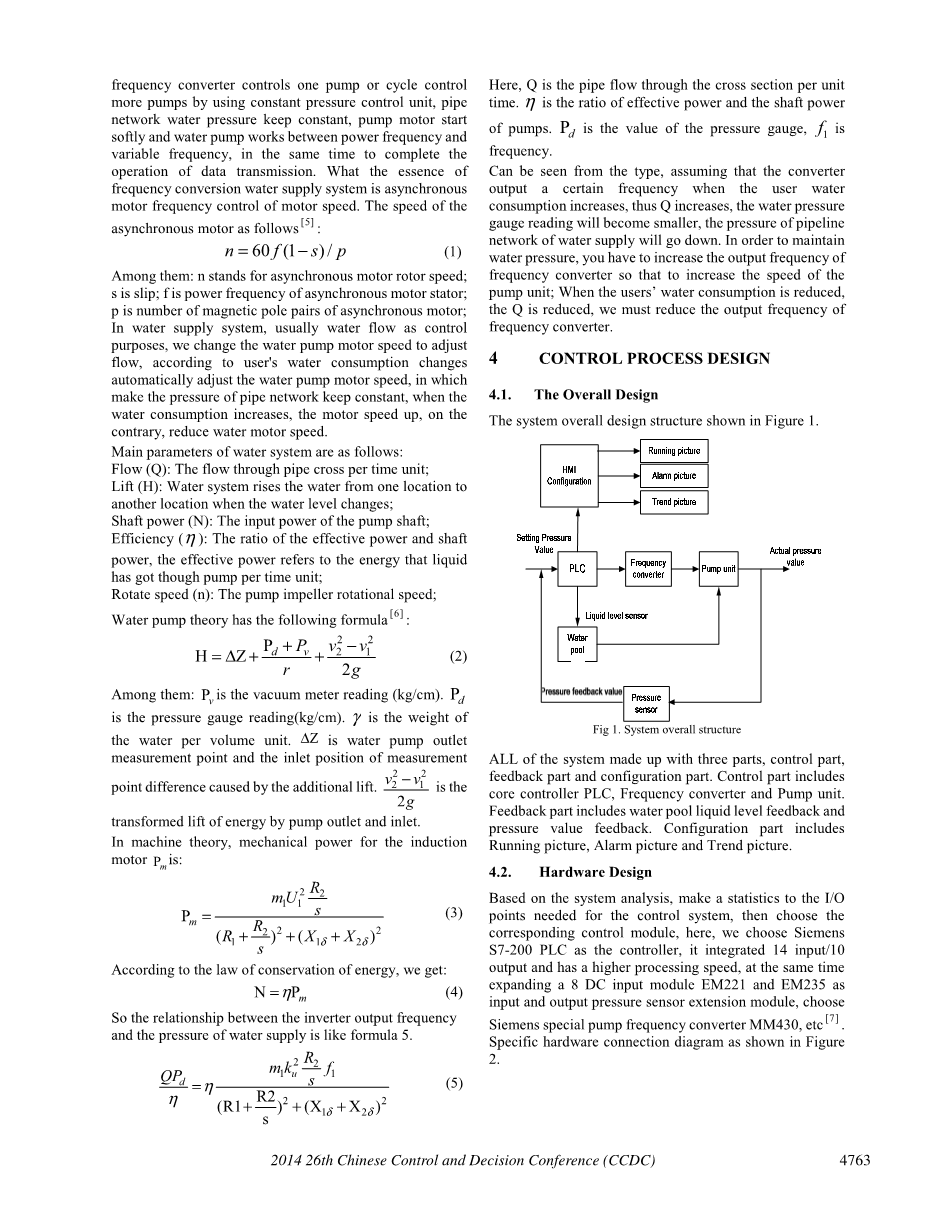 这个系统主要包括压力传感器,频率采集模块,PLC,水泵单元和一些低压电器组成。控制过程可以被描述为那些频率转换器通过恒压供水单元控制一个泵或者循环控制很多个泵,管道网络的水压保持恒定,泵发动机开始软启动而且水泵工作在工频和变频之间,同时也完成数据传输的工作。频率转换供水系统的本质就是异步电机的变频调速控制。异步电机的速度公式如下: