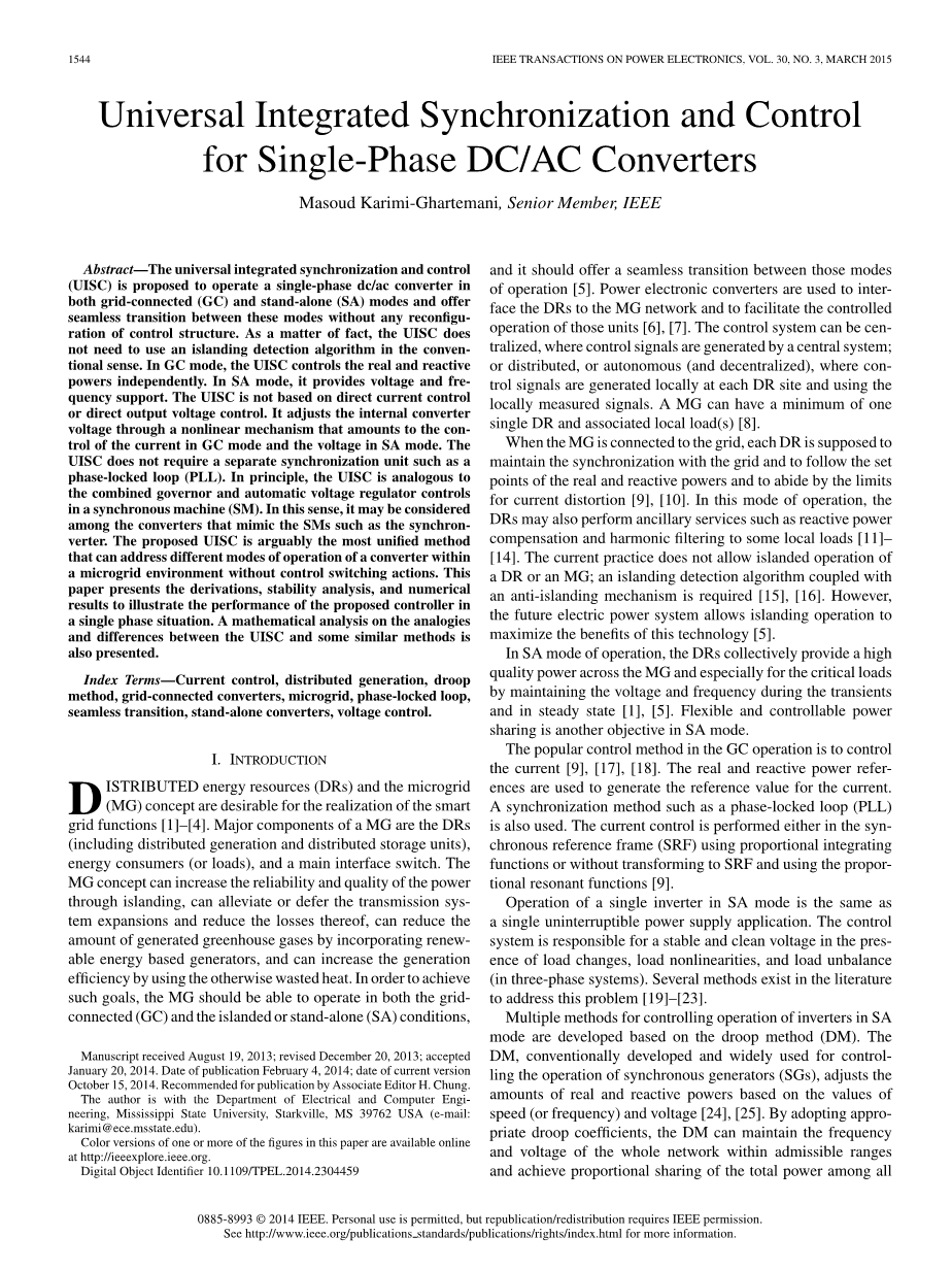 摘要:通用集成同步和控制(UISC)被提出用于在并网(GC)和独立(SA)模式下运行单相dc / ac转换器,并提供这些模式之间的无缝转换,无需重新配置控制结构。 事实上,UISC不需要使用传统意义上的孤岛检测算法。 在GC模式下,UISC独立控制实际功率和无功功率。在SA模式下,它提供电压和频率支持。UISC不是基于直流电流控制或直接输出电压控制。它通过非线性机制调节内部转换器电压,这相当于GC模式下的电流控制和SA模式下的电压控制。 UISC不需要单独的同步单元,如锁相环(PLL)。原则上,UISC类似于同步电机(SM)中的组合调速器和自动电压调节器控制。从这个意义上讲,它可以被认为是模拟SM的转换器,例如同步器。 所提出的UISC可以说是最统一的方法,可以解决微电网环境中的转换器的不同操作模式而无需控制切换动作。本文介绍推导,稳定性分析和数值结果来说明所提出的控制器在单相情况下的性能。 还介绍了UISC和类似方法之间类比和差异的数学分析。