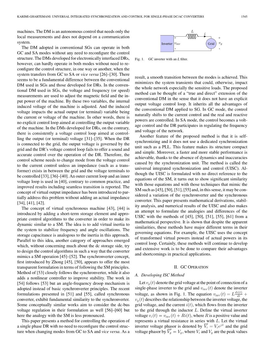 所提出的方法的另一个特征是它是自同步的并且不使用诸如PLL的专用同步单元。 此功能使其结构紧凑而简单。 此外,由于没有由同步单元导致的动态和不准确性,因此可以实现更快且更稳定的性能。 该方法被称为通用集成同步和控制(UISC)。 尽管UISC的制定并未直接参考SM的方程,但它显示出与那些方程以及模拟SM的技术显着相似,如[45],[50],[51],[55] ],并且在这个意义上,它可以被认为是同步器和同步转换器的变体。 本文介绍了UISC的数学推导,稳定性分析和数值结果,并尝试用[45],[50],[51],[55],[ 61]从数学角度。 它表明,尽管有明显的相似性,但这些方法在它们的控制方程中有着不同的术语。 例如,UISC在其控制回路中使用变换的虚拟功率的概念,而不是实际的力量。 当然,这些方法将继续发展,并且要做大量的工作来比较它们在实际应用中的优点和缺点。