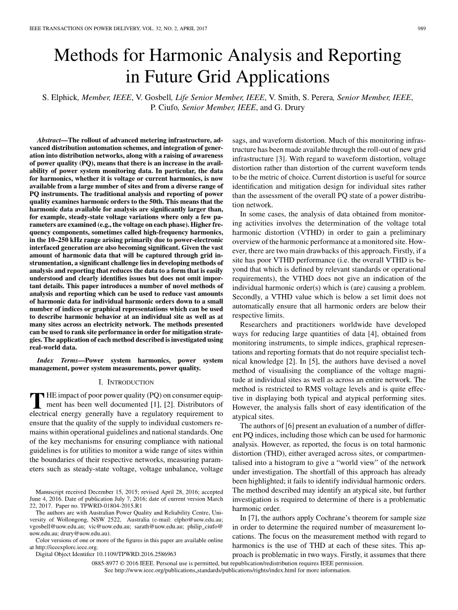 摘要——先进的计量基础设施,先进配电自动化方案与发电集成进入分销网络,随着对电能质量(PQ)的认识的提高,意味着电力系统监测数据有一个实用性的增加。特别是,对于谐波数据,无论是电压或电流谐波,现在可从大量的网站和各种各样的PQ工具获得。传统的对电能质量谐波检测的分析和报告位居第50位。这意味着可用于分析的谐波数据显著偏大,例如,只有几个参数的稳态电压变化检查(例如,每个阶段的电压)。更高的频率组件,有时称为高频谐波,在10 - 250千赫范围内,主要是由于电力电子接口生成也变得很明显。由于大量的通过网格仪器捕获的谐波数据量,一个重要的挑战在于发展研究分析措施和报告,减少数据的形式,很容易理解和清楚地识别问题,但不遗漏重要细节。本文介绍了一些新的分析方法和报告,可用于减少大量谐波数据的个别谐波订单下降到一个小可使用的索引或图形表示的数目描述单个站点的谐波行为以及在许多站点横跨电力网络。提出的方法可用于排名的顺序formitigation策略网站性能。所描述的每一种方法的应用研究现实世界的数据。