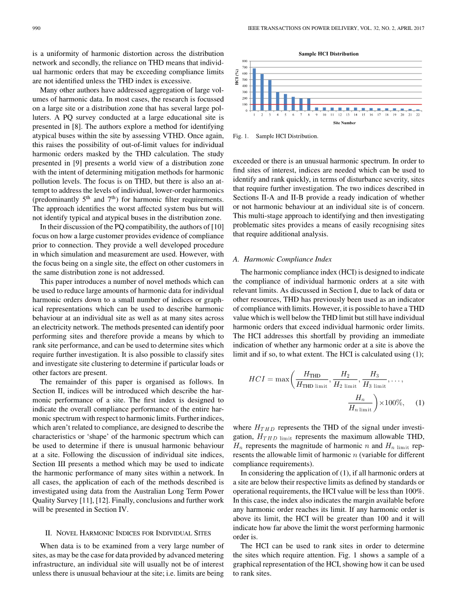 本文的其余部分组织如下。 在第二部分将介绍描述谐波的指标一个网站的表现。 第一个索引旨在表明整个谐波的总体符合性能频谱相对谐波极限。 其他指标,与规范无关,旨在描述谐波谱的特征或“形状”可以用于确定是否存在异常谐波行为在一个网站。 在讨论个别地点指数后,第三节介绍一种可用于指示的方法网络中许多站点的谐波性能。 在所有情况下,每种应用方法都是描述的