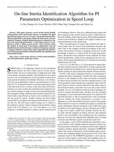 摘要--本文提出了一种基于负载转矩观测器的在线惯性校正方法,用于优化伺服系统的速度环PID参数。本文提出的惯性辨识算法采用固定阶递推经验频域最优参数估计来提高速度环的性能。为了获得更精确的惯性值,采用了负载转矩观测器。在此基础上,在频域推导了辨识惯量和负载转矩的转速环PI参数优化方法。并与递推最小二乘算法比较,仿真和实验结果验证了该方法的有效性。