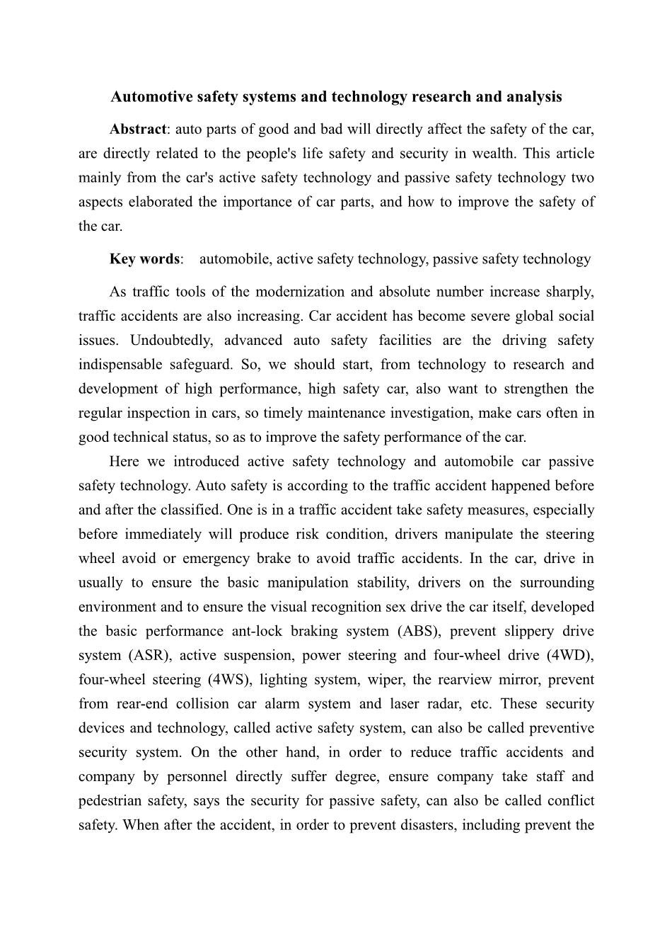 Abstract: auto parts of good and bad will directly affect the safety of the car, are directly related to the people#39;s life safety and security in wealth. This article mainly from the car#39;s active safety technology and passive safety technology two aspects elaborated the importance of car parts, and how to improve the safety of the car.