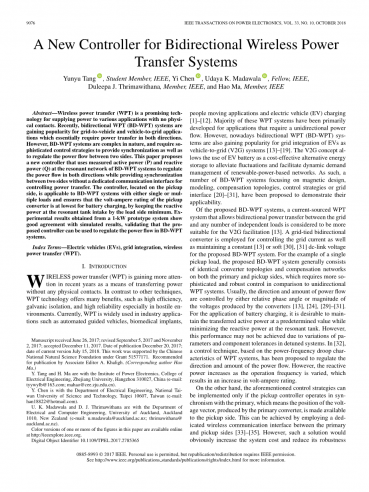 无线充电(WPT)技术是一种无物理接触的应用场合的一种很有前途的供电技术。最近,双向WPT(BD-WPT)系统越来越流行,它是电网到车辆以及车辆到电网的应用,这基本上需要在两个方向的电力传输。 然而,BD-WPT系统本质上是复杂的,需要复杂的控制策略来提供同步以及调节两侧的功率流。 本文提出一种利用实测有功功率(P)和无功功率(Q)的新型控制器BD-WPT系统谐振网络的功率调节,在提供同步的同时,双向的功率流双方之间没有专用的通信接口控制电源传输。在拾音器上适用于单负载或多负载的BD-WPT系统的控制器,确保拾取器的伏安额定值变频器对电池的充电是最低的,通过保持无功负载侧谐振槽进气口功率最小。实验结果从一个1千瓦的原型系统显示仿真结果与仿真结果吻合较好,验证了所提出的控制器可用于BD-WPT系统的潮流调节系统。