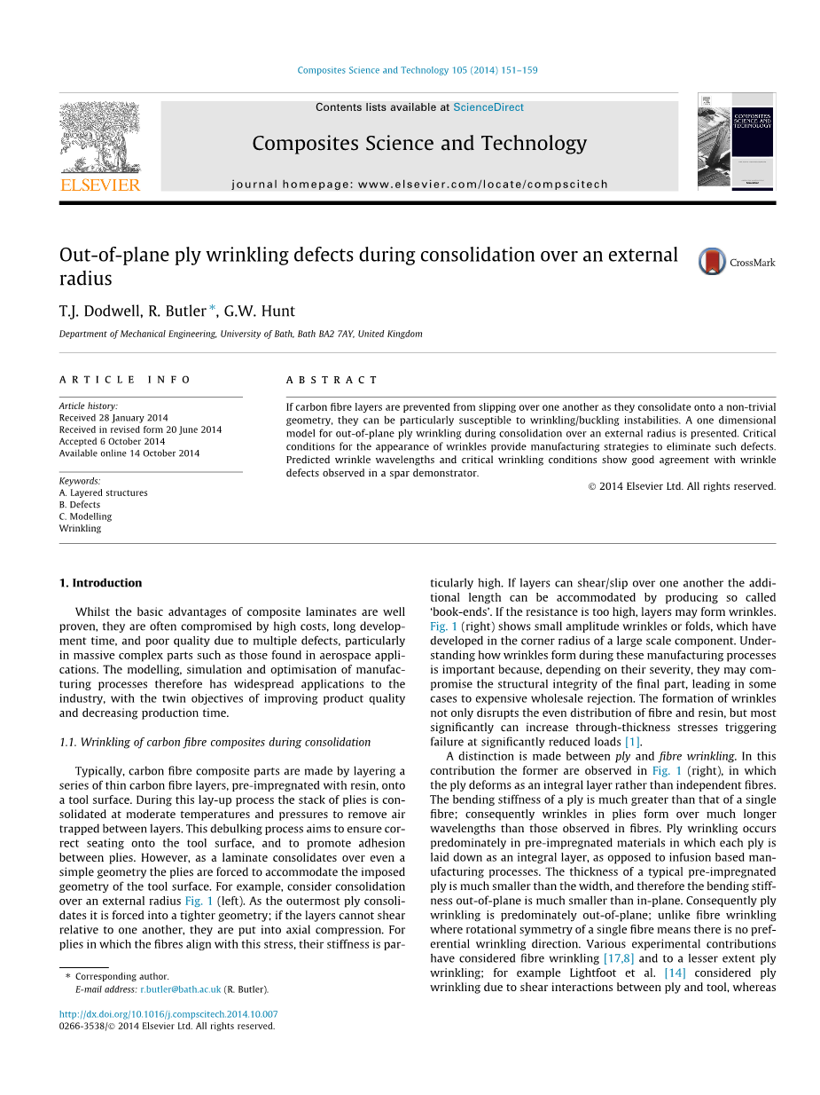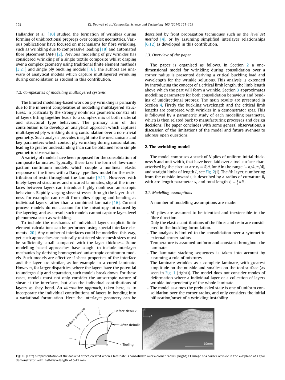 典型地,碳纤维复合材料部件通过将预先用树脂预浸渍的一系列薄碳纤维层分层到工具表面上而制成。在这种铺设过程中,叠层在中等温度和压力下被固结,以去除夹层之间的空气。这种去毛刺过程的目的是确保正确定位到工具表面上,并促进层之间的粘合。然而,由于即使是简单的几何形状,层压板也会被压实,所以层必须适应所施加的工具表面的几何形状。例如,考虑外部半径上的合并图1(左)。随着最外层合并,它被迫变为更紧密的几何形状;如果这些层不能彼此相对剪切,则它们会被轴向压缩。对于纤维与这种应力对齐的纤维层来说,它们的刚度特别高。如果层可以相互剪切/滑动,可以通过生成所谓的“书挡”来适应附加长度。如果阻力太高,层可能会形成皱纹。图1(右)显示了在大尺寸组件的拐角半径中形成的小振幅皱褶或褶皱。了解在这些制造过程中皱纹如何形成是重要的,因为根据它们的严重性,它们可能会损害最终部件的结构完整性,导致在某些情况下导致昂贵的批发拒收。皱纹的形成不仅破坏了纤维和树脂的均匀分布,而且最显着的是可以增加贯穿厚度的应力,从而在明显降低载荷的情况下引发失效[1]。