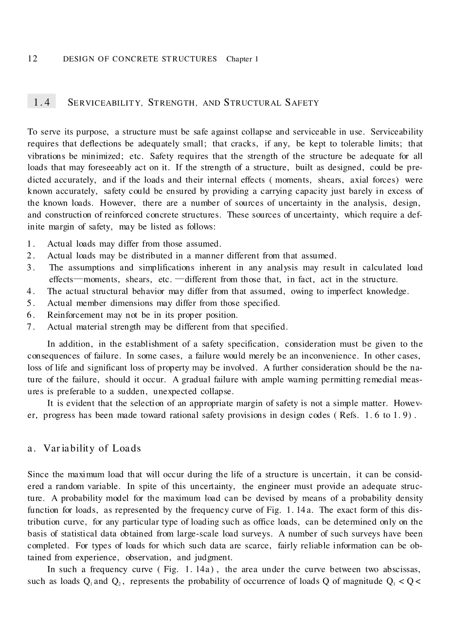 在建筑的使用过程中,最大荷载出现的时间是不确定的,它能被视为一个随机变量,虽有着这一不确定性,工程师必须设计一个足够抵抗这一最大荷载的结构,通过载荷的概率密度分布函数,可设计出适用于这一最大荷载的可行模型,就像在图表1.14a频率曲线中呈现的那样。这一频率曲线的具体形式,包括那些例如办公室荷载的特殊荷载情况的形式,都能在这些从大量载荷调查中获得的统计数据的基础上决定,而大量的这些荷载调查工作都已经完成,对于那些数据缺乏的荷载形式,可以通过经验、观察和判断来获得相当可靠的信息。