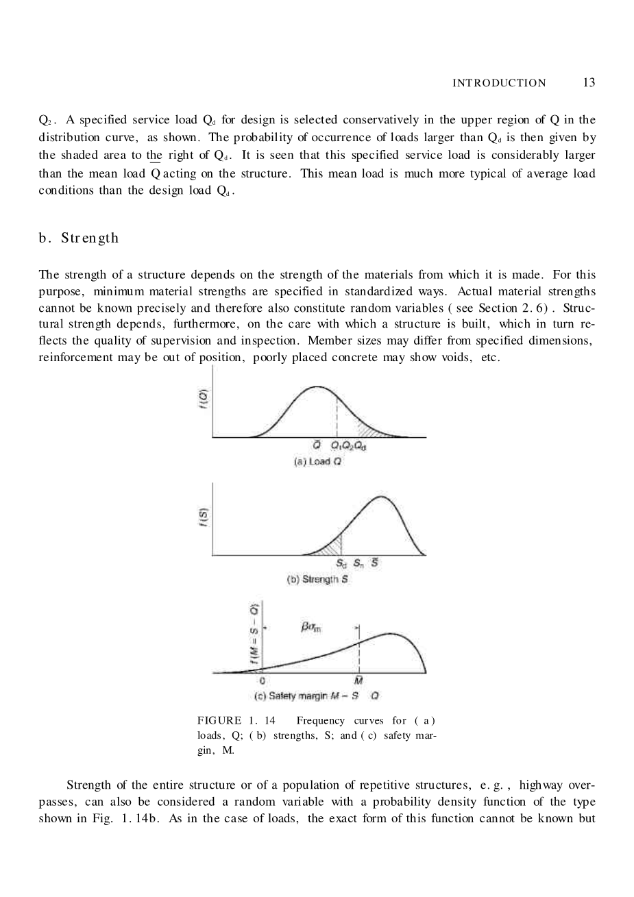 在这样的频率曲线中(图1.14a),位于两个横坐标之间曲线下方的区域,如荷载和,代表了载荷Q发生的可能性大小是,用作设计的给定工作荷载保守地选择在分布曲线上Q的上方部分,如图所示。大于的荷载出现的可能性大小是图中右边的阴影部分,可以看出,这个给定的工作荷载是远大于作用在结构上的平均荷载Q的,这意味着平均荷载比设计荷载更具代表性。