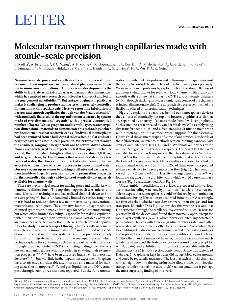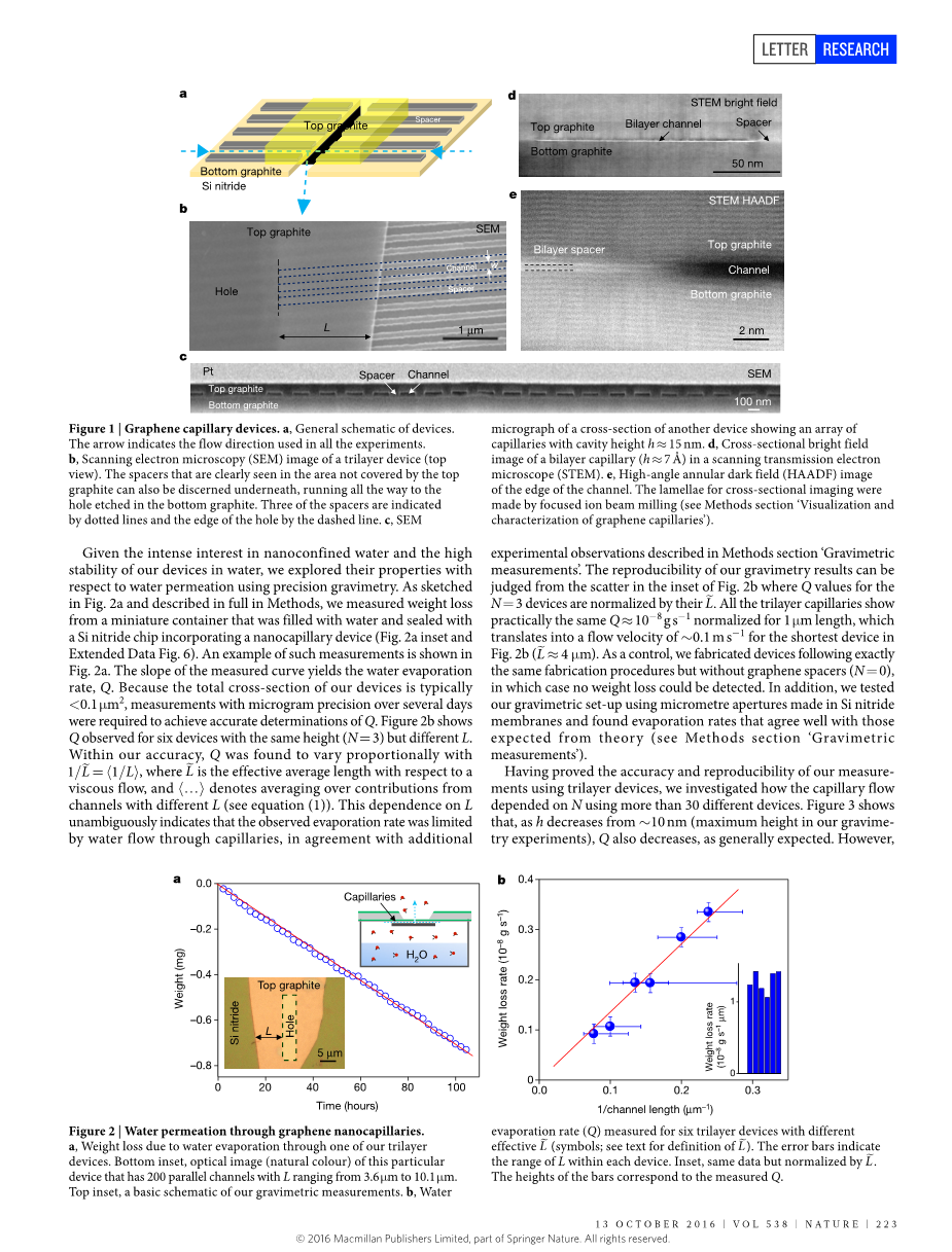 纳米尺度的毛孔和毛细血管因其在许多自然现象中的重要性以及它们在许多应用中的重要性而被长期研究。最近的发展是制造具有纳米尺寸的人造纳米通道的能力,这使得关于分子运输的新研究成为可能并且导致纳米流体的出现。但是,表面粗糙度尤其使得在这个空间尺度下产生精确控制尺寸的纳米通道具有挑战性。在这里,我们报告通过van der Waal组件制造狭窄且光滑的纳米通道,其顶部和底部的原子级平板被由二维晶体制成的间隔物分开,并具有精确控制数量的层。我们使用石墨烯及其多层作为原型二维材料来演示此技术,该技术可以生成结构,可以将其视为单个原子平面从大块晶体中移除,留下具有原子级精度选择的高度的平坦空隙。水从通道中通过,从一个到几十个原子平面的高度范围内运输,其特征在于出乎意料的快速流动(高达每秒1米),这归因于高毛细压力(约1,000 bar)和大的滑移长度。对于只能容纳几层水的通道,流量表现出明显的增强,我们将其与纳米水中增加的结构顺序联系起来。我们的工作开辟了一条通道,可以制造尺寸可调至Aring;精度的纳米通道和龋洞,并且其渗透特性可通过多种可用于通道壁的原子级平面材料进一步控制。