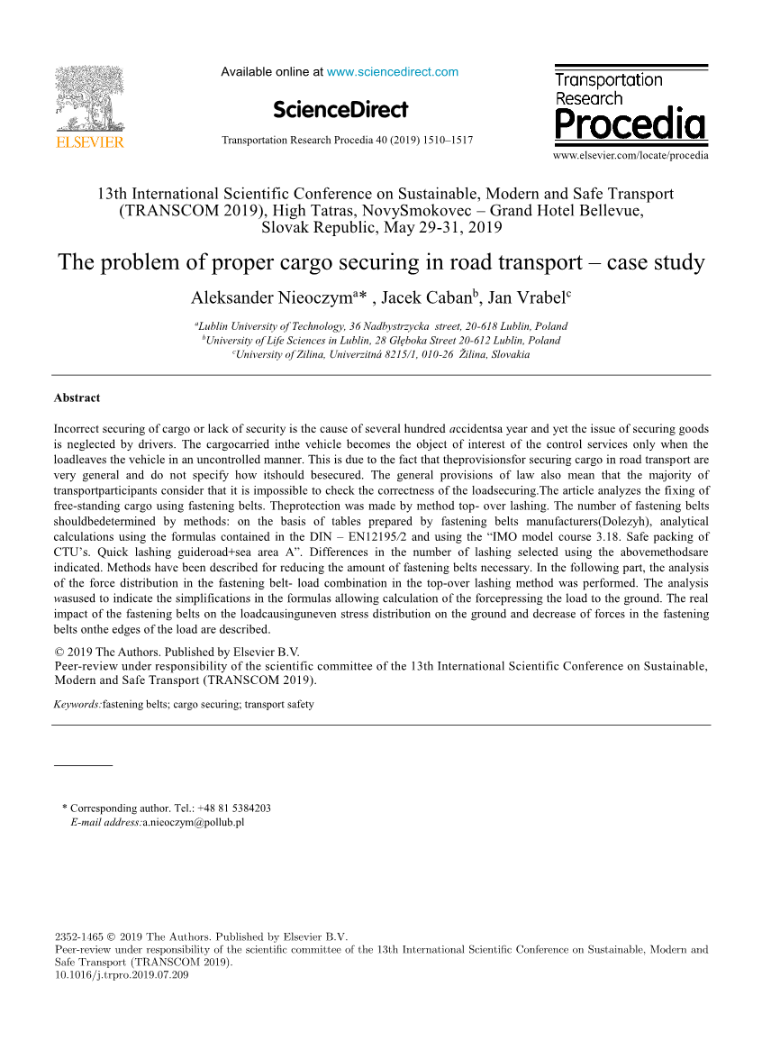 摘要:不正确的货物固定或缺乏安全保障是每年发生数百起事故的原因,然而货物安全保障问题却往往被司机们忽视了。只有当货物不受控制离开车辆时,车内的货物才会成为控制服务的目标。这是因为道路运输中保障货物安全的规定非常笼统,没有具体说明应该如何保障货物安全。法律的一般规定也意味着,大多数运输参与者认为可以不检查装载安全的正确性。本文分析了使用固定带对独立货物的固定问题。该保护措施采用的是套索绑扎法。应采用以下方法确定固定带的数量: 根据固定带制造商(Dolezyh)编制的表格,使用 DIN-EN12195/2 中的公式和使用“ IMO 示范课程3.18”进行分析计算。而CTU 的安全包装与“快速绑扎导轨 海域 A”指出了使用上述方法选择的绑扎次数的差异。描述了减少必要的固定带数量的方法。在接下来的部分中,我们分析了顶部绑扎法中的固定带-荷载组合中的力分布。分析被用来表明公式的简化,允许计算向地面施加的载荷。阐述了固定带对载荷的实际影响,这种影响导致了地面应力分布的不均匀以及固定带在载荷边缘处 受力减小。