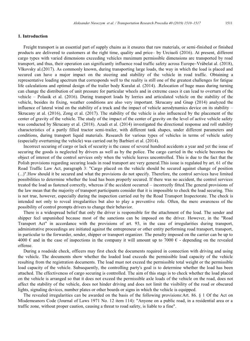 货物运输是供应链的重要组成部分,因为它确保原材料、半成品或成品以优秀的质量和完美的价格在正确的时间交付给客户。目前,那些超过车辆最大允许尺寸的不同货物类型都是通过公路运输运输的,因此,其运营可以对整个欧洲的道路交通安全产生重大影响 。众所周知,在运输大型货物时,货物的放置和固定方式会对车辆在道路交通中的转向和稳定性产生重大影响。获得符合实际情况的代表性载荷谱仍然是最大挑战之一疲劳寿命计算和优化设计的拖车机身Kuralat(20144)。在转弯过程中重大货物的重新定位可以改变特定车轮的单位压力分布,在极端情况下可能导致车辆倾覆-Polasik(2016)。在货车和铰接式车辆运输时,除了其货物固定外,天气条件对车辆的稳定性也很重要。Skrucany 和 Gnap (2014)分析了侧向风对卡车稳定性的影响以及车辆空气动力装置对其稳定性的影响。车辆的稳定性也受到车辆重心位置的影响。Skrucany 等(2018)对重心对主动车辆安全水平的影响进行了研究。Azadi等(2014)研究了部分填充拖拉机半拖车在不同罐体形状、不同参数和条件下输送液体物料时的方向响应和侧倾稳定性特性。Barbieri等(2014)对各种类型的车辆在车辆安全(特别是翻车)方面进行了研究。不正确的货物固定或缺乏安全保障是每年发生数百起事故的原因,但司机和警察往往都忽视了货物安全保障问题。只有当车辆不受控制地离开时,车内的货物才会成为控制服务的目标。这是因为波兰关于确保道路运输货物安全的规定非常笼统。这一问题由《道路交通法》第 61 条第 3 款规定:“放置在车辆上的货物应当防止位置变更带来的不利影响(hellip;hellip;)”。该如何确保货物的安全,条款没有具体说明。因此,控制服务和确定负载是否已妥善安全的可能性有限。如果没有发生事故,则装载部门将负载正确地固定,而如果事故发生便意味着不正确地安装。该法律的一般规定意味着大多数运输参与者认为可以检查负载的安全性。然而,事实并非如此, 特别是在道路运输监察局进行的检查中。这项检查不仅是为了揭露违规行为,也是为了起到预防的作用。 通常,仅仅意识到控制的可能性就会促使司机改变他们的行为。 人们普遍认为,只有司机学要对货物的运输安全负责,而寄件人和托运人则不需要受到惩罚,因为大部分的惩罚都可以强加给司机。但是,根据《道路运输法》第 93 条的规定,如果在运输过程中出现违规情况时,则应该对从事道路运输的企业家或其他实体提起行政诉讼,特别是对货代、发货人、托运人或运输组织者。对承运人的处罚最高可达 4000欧元,如果在公司进行检查,罚款最高可达7000欧元,具体取决于被发现的违法行为。 在路边检查时,警察们可能会首先检查与驾驶和使用车辆有关的文件。该文件显示车辆登记文件所载的负荷量是否超出车辆的许可负荷量。载重不得超过车辆的许可总重量或许可载重量。随后,控制方目标是确定负载是否已经附加以及货物安全的有效性是否受到控制。这个阶段的目的是检查车辆所承受的负荷是否安排得不超过道路上车辆的允许轴重,不影响车辆的稳定性,不妨碍驾驶,也不限制道路或车辆所备的遮蔽灯、信号装置、车牌或其他牌照或标志的能见度。 发现的违规行为可根据以下规定予以裁定: 第八十六条。《轻罪法》(《法律杂志》 ,1971 年,第 12 期, 第 114 项)第 1 条规定:“任何人在公共道路、居民区或交通区,未经适当警惕,对道路安全构成威胁,应处以罚款”。