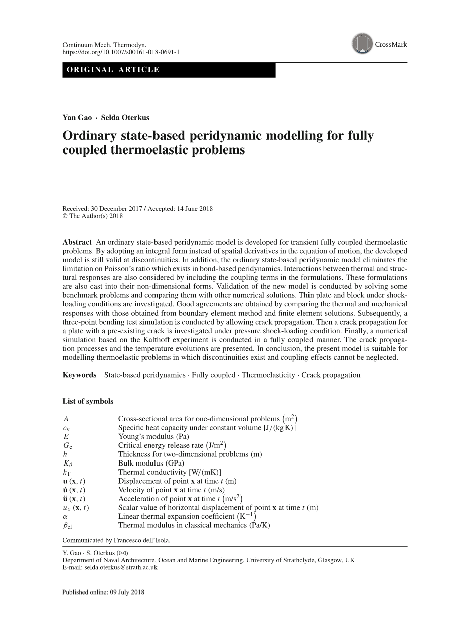 - 当热弹性问题涉及不连续时,上述基于经典力学理论的数值模拟方法可以预测无边界应力和能量密度。即使对于线性弹性断裂力学(LEFM)和位错动力学,确定位错的运动也需要补充本构方程。相反,周动力学( PD)[15-20]是非局部理论,包含在材料响应损伤的一部分。在经典的连续介质力学中,周动力学的公式是积分微分形式,而不是空间推导方程。因此,当裂纹或终止合并[22]时,PD方程仍然有效。因此,PD理论特别适用于不连续的问题;因此,在本文采用了该方法。PD理论领域的许多研究者已经对裂纹的成核和扩展进行了研究[23-38],但他们大多只局限于力学领域。在热场方面,Oterkus等人利用PD理论推导出热扩散公式,并利用其捕获燃料颗粒开裂[40]。Bobaru和Duangpanya[41,42]在基于键的PD理论中研究了有间断和无间断物体的热传导。关于热力学方面,Oterkus et al.[43]、Oterkus[44]、Madenci、Oterkus[45]等人提出了基于全耦合键的PD理论。进一步,他们成功地应用他们的模型预测了裂纹扩展[46,47]。然而,基于键的PD模型被限制为具有固定的泊松比,即三分之一的二维问题,四分之一的三维问题为[48]。考虑到这一约束,对于热力学问题一个消除上述限制的广义PD模型是必要的。