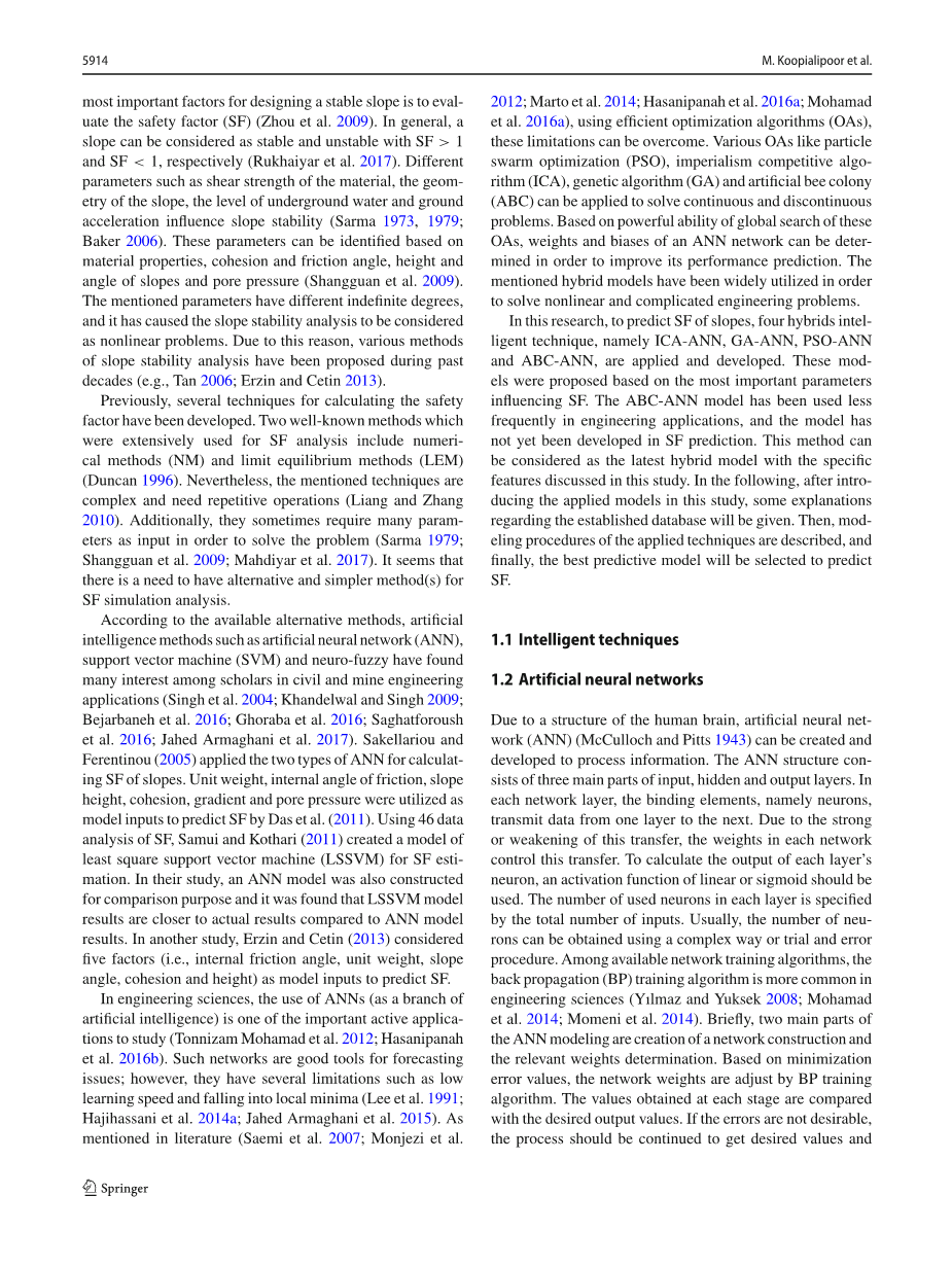 根据现有的替代方法,人工神经网络(ANN)、支持向量机(SVM)和模糊神经网络(neuro fuzzy)等人工智能方法在土木工程和矿山工程中得到了广泛的应用(Singh等,2004年;Khandelwal和Singh 2009年;Bejarbaneh等,2016年;Ghoraba等人,2016年;Saghatforoush等,2016年;Jahed Armaghani等人,2017年)。 Sakellariou和Ferentinou(2005)将两种类型的神经网络应用于计算边坡的SF。以容重、内摩擦角、坡高、粘聚力、坡度和孔隙压力为模型输入,利用Das等方法对SF进行预测。(2011年)。Samui和Kothari(2011)通过对SF的46个数据分析,建立了SF估计的最小二乘支持向量机(LSSVM)模型。在他们的研究中,还构建了一个神经网络模型进行比较,发现LSSVM模型的结果比ANN模型的结果更接近实际结果。在另一项研究中,Erzin和Cetin(2013)将五个因素(即内摩擦角、单位重量、坡度角、粘聚力和高度)作为预测SF的模型输入。