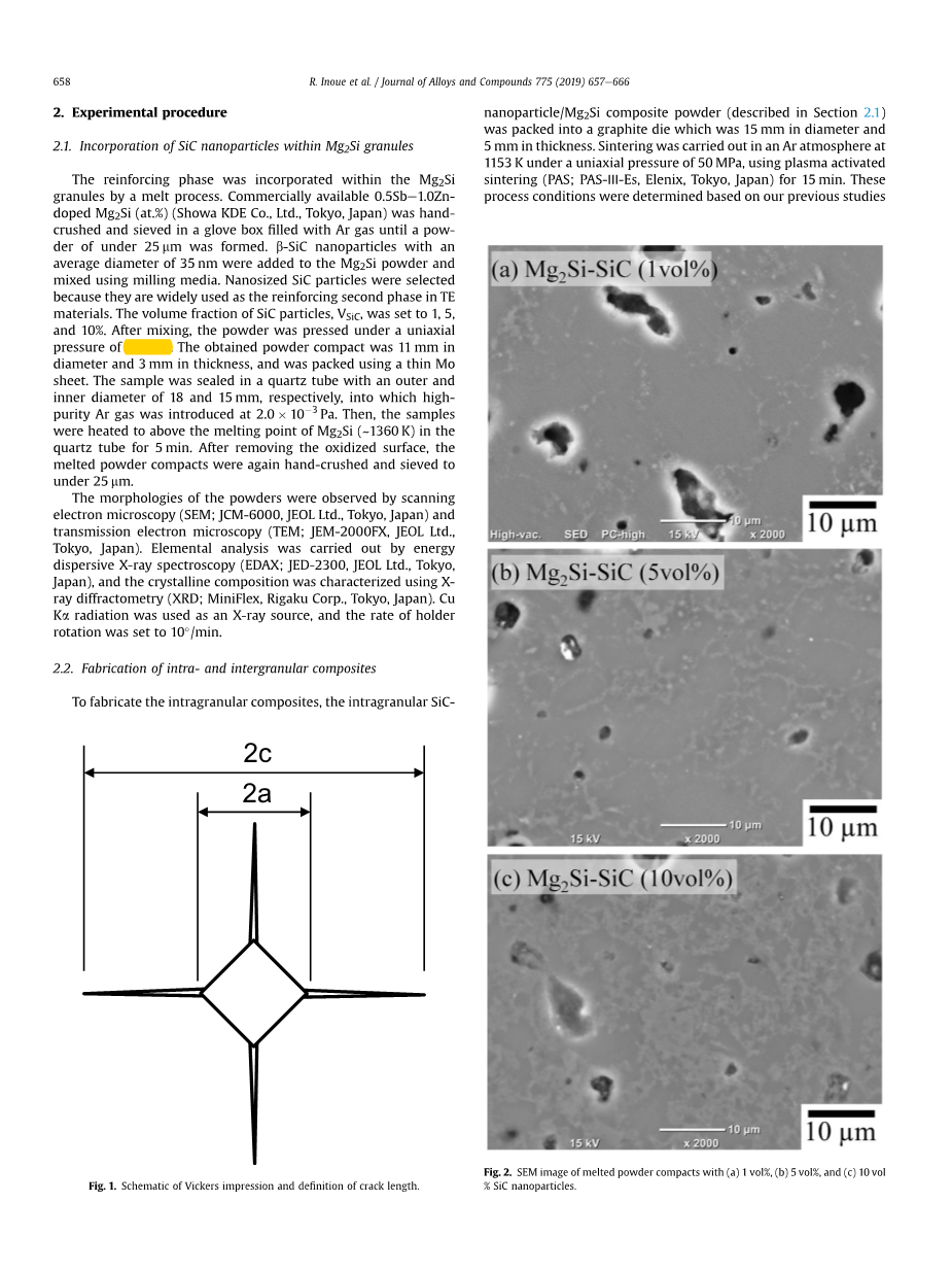 通过熔融过程,增强相被纳入Mg2Si晶粒中。将商用0.5Sb-1.0Zn掺杂Mg2Si (at.%)(KDE Co. Ltd,日本东京)置于充满氩气的手套箱中,手工研磨后筛选得到25 mu;m以下粒径的粉末。在Mg2Si粉末中加入平均直径为35 nm的beta;-SiC纳米颗粒,球磨混合。之所以选择纳米尺寸的SiC颗粒,是因为它们被广泛用作热电材料中的增强相。SiC 颗粒的体积分数VSiC设置为 1、5 和 10%。混合之后,在30 MPa的单轴压力下对粉末进行压缩。获得的块体直径为11 mm,厚度为3 mm,用Mo薄片包装。样品密封在外径和内径分别为18 mm和15 mm的石英管中,在2.0times;10-3 Pa下充入高纯度氩气。之后将样品放到石英管中以高于Mg2Si熔点的温度(~1360 K)加热5分钟。去除氧化层后,将熔融后的粉块再次经过手工研磨,筛到25 mu;m以下。