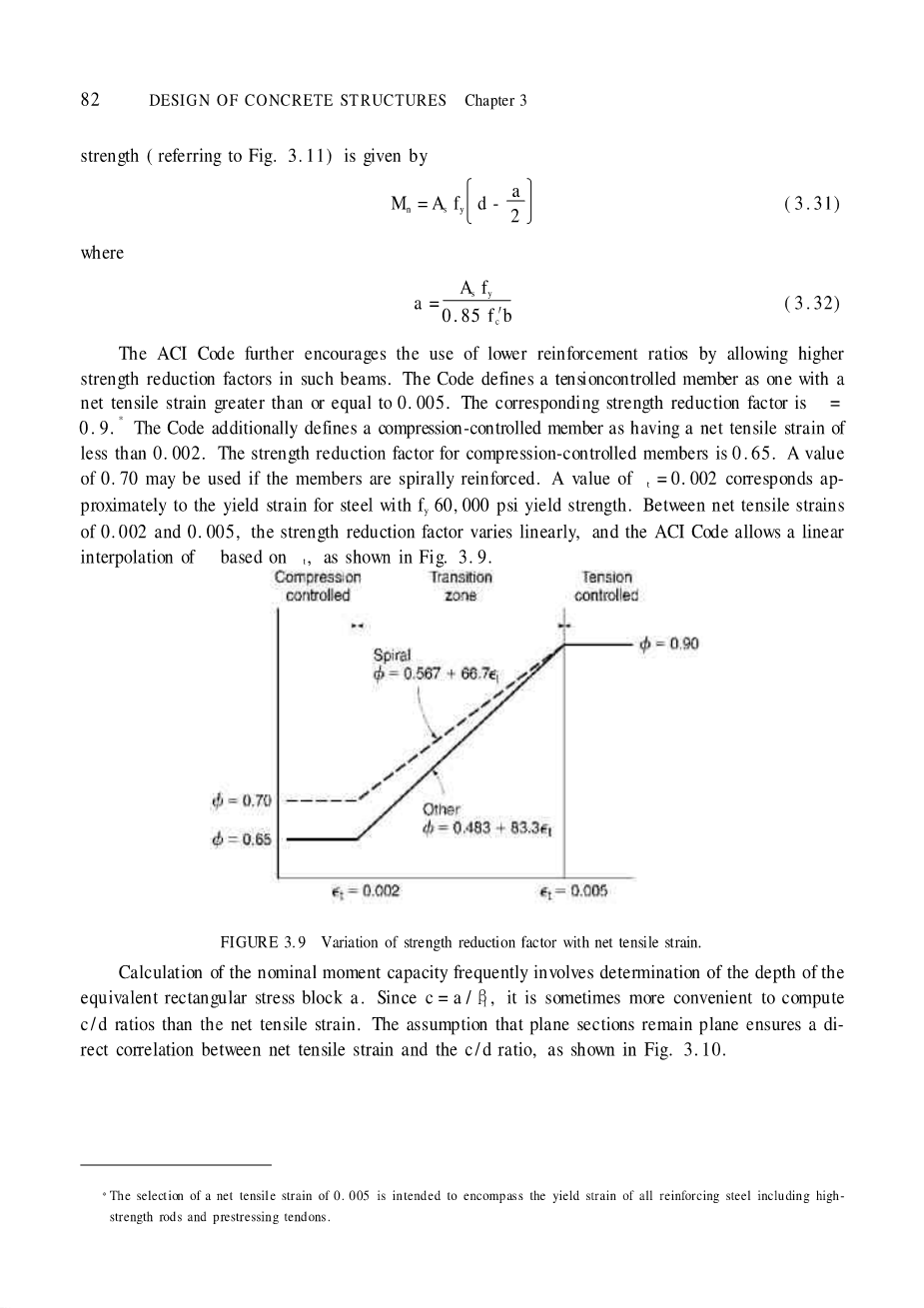 ACI规范更多的鼓励在这样的梁中通过允许更高的强度折减系数来降低配筋率,规范定义了一个由拉力控制的量,作为一个和净拉伸应变相关的大于或者等于0.005相关的量,相关的强度折减系数 =0.9,规范另外定义了一个由受压控制的系数当净拉伸应变小于0.002,这时的强度折减系数是0.65,。当构件为螺旋强化时可以使用0.70,t=0.002可以使用当趋近钢筋屈服,在fy60000psi屈服强度的条件下。净拉伸应变在0.002和0.005之间,强度折减系数呈线性分布,并且规范允许根据t进行线性插值,由图3.9可知