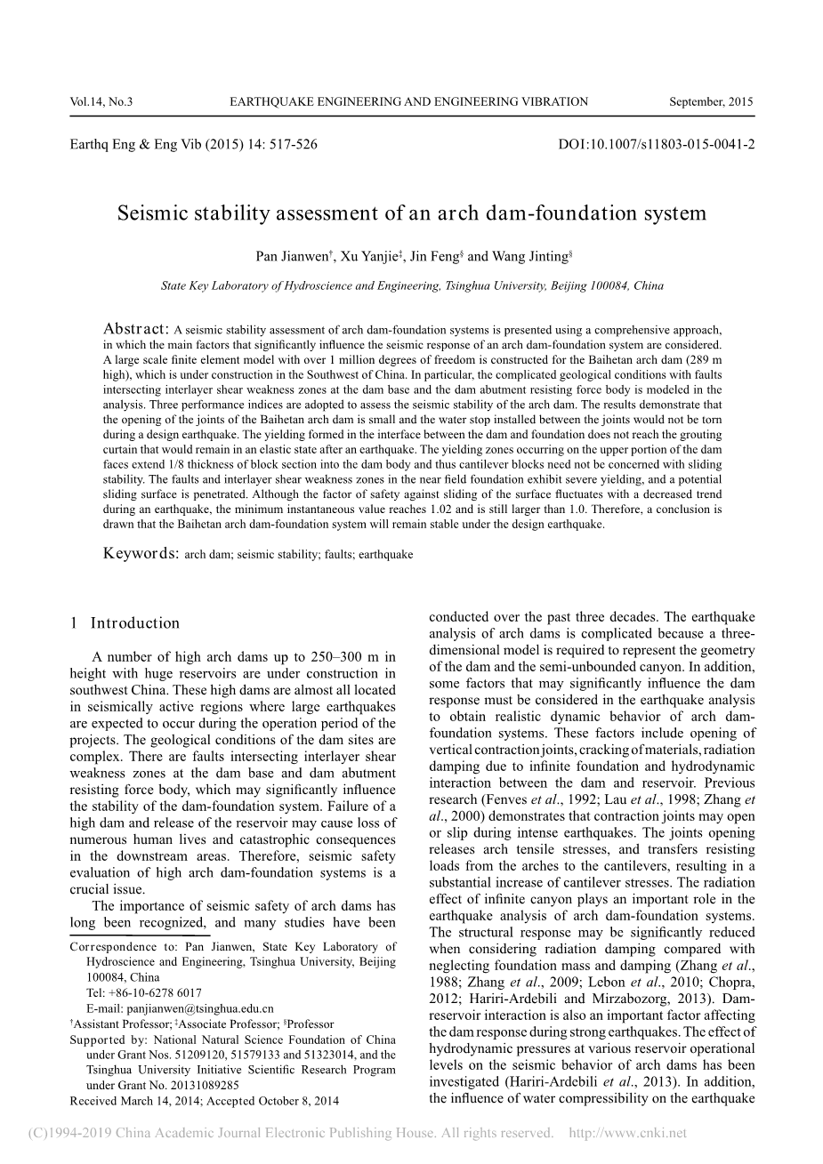 摘要:考虑到对拱坝-地基系统的地震反应有显著影响的主要因素,拱坝-地基系统的地震稳定性评估采用了一种综合方法。在中国西南地区正在建设的白鹤滩拱坝高289米,为其构建一个超过100万个自由度的大型有限元模型。特别是在分析中模拟出了坝基和坝肩抗力体处断层与层间剪切软弱带相交的复杂地质条件。采用三个性能指标来评估拱坝的地震稳定性。结果表明,白鹤滩拱坝接缝开度小,接缝之间的止水带在设计地震中不会被撕裂。在大坝和地基之间的界面上形成的屈服并没有达到灌浆的目的,在地震后仍保持弹性状态。出现在坝面上部的屈服区将1/8厚度的块体段延伸至坝体,因此悬臂块体不需要担心滑动稳定性问题。近场地基中的断层和层间剪切弱点区表现出严重的屈服,潜在的滑动面被穿透。地震期间,尽管表面滑动安全系数呈下降趋势,但最小的瞬时值达到1.02,仍然大于1.0。由此得出结论,白鹤滩拱坝-地基系统在设计地震作用下将保持稳定。