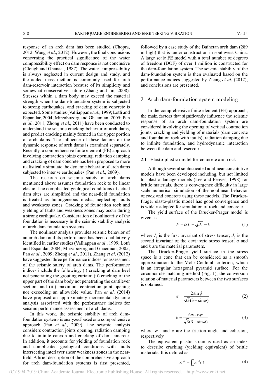 尽管已经开发了几个复杂的非线性构成模型,包括但不限于针对脆性材料的塑性破坏模型(Lee和Fenves,1998),但使用这些模型对岩石和混凝土的非线性行为进行大规模数值模拟时存在收敛困难。Drucker-Prager弹塑性模型具有良好的收敛性,被广泛用于岩石和混凝土的模拟。