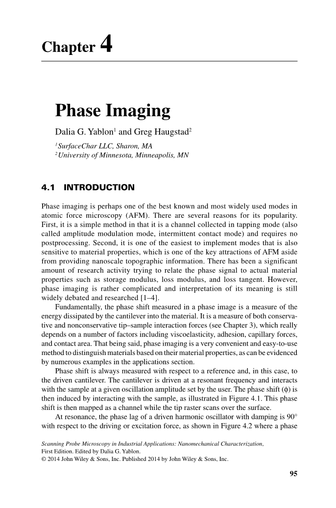 从根本上说,在相位成像中测量的相移是悬臂梁耗散到材料中的能量的量度。它是保守和非保守针尖-样品相互作用力的测量(见第3章),它实际上取决于许多因素,包括粘弹性,粘附力,毛细管力和接触区域。也就是说,根据应用部分中的大量示例证明,相位成像是一个非常方便和利于使用的根据材料属性区分材料的方法。