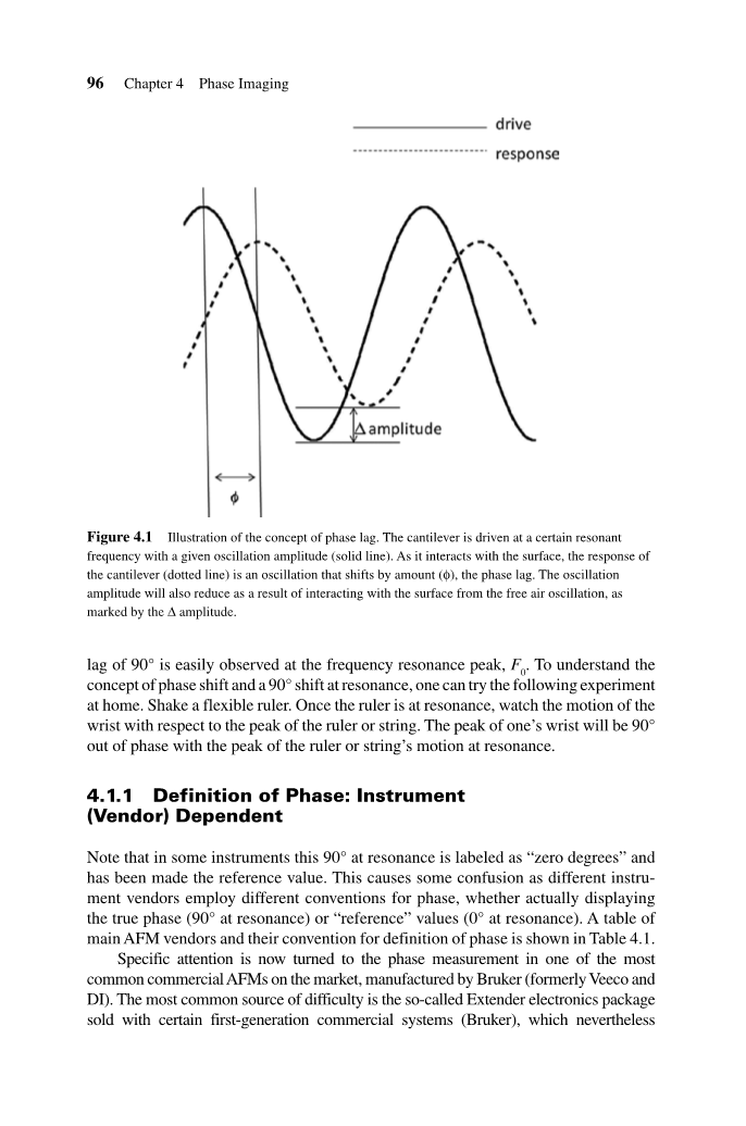 请注意,在某些仪器中,此共振90°标记为“零度”,并已作为参考值。这会引起一些混乱,因为不同的仪器供应商对相位采用不同的约定,无论是实际显示真实相位(共振时为90°)还是“参考”值(共振时为0°)。表4.1列出了主要AFM供应商的表格及其定义相的惯例。现在最受关注的相位测量市场上,最普遍的一种商业AFM是由Bruker(前身为Veeco和DI)制造。最常见的困难来源于某些第一代商业系统(Bruker)一起销售的所谓扩展器电子组件的东西,但仍然是常用的(即,仍然是有价值的仪器)。相位扩展器单元是许多早期控制器(NanoscopeIII-IV)的附加装置,其设计目的不仅仅是测量相位本身。真实相位的测量需要锁定放大器或类似的复杂装置来跟踪两个正弦波的相对时间偏移,此外,其频率范围可扩展到数百千赫兹。但扩展器可以进行校准,以提供非常接近真实相位的数字,用于大多数感兴趣的测量。感兴趣的话,第4.3.3节提供了这种校准的详细说明。