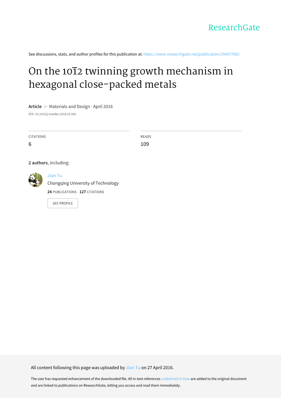 关键词: 密排六方结构金属孪晶界;{102 }孪晶机制