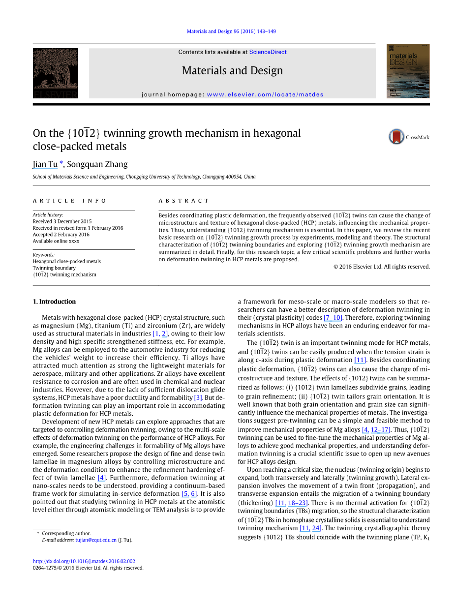 除了协调塑性变形外,经常观察到的{102 }孪晶可以引起密排六方结构(HCP)金属的微观结构和织构的变化,从而影响机械性能。因此,了解{102 }孪晶机制至关重要。在本文中,我们通过实验,建模和理论回顾了{102 }孪晶生长过程的最新基础研究。详细总结了{102 }孪晶边界的结构表征和探索{102 }孪晶生长机理。最后,针对本研究课题,提出了一些关键的科学问题,并进一步研究了密排六方结构金属中的变形孪晶。