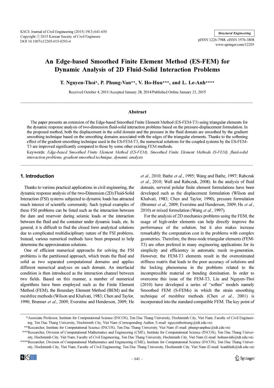 根据这一趋势,本文进一步将ES-FEM-T3的应用扩展到基于压力 - 位移公式的2D FSI问题的动态响应分析。在所提出的方法中,基于与三角形元素的边缘相关联的平滑域,通过梯度平滑技术平滑实心域中的位移和流体域中的压力。 将执行两个数值示例来说明所提出的耦合方法的效率。