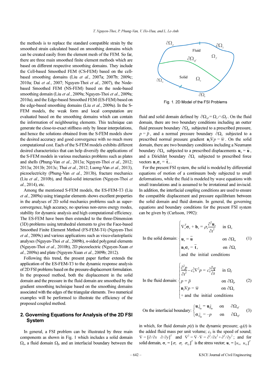 解决FSI问题的有效数值方法之一是分区方法,其将流体和固体视为两个分离的计算域,并对每个域应用不同的数值分析。然后引入界面条件作为两个场之间的交互通道。基于这种方式,已经采用了许多数值算法,例如有限元法(FEM),边界元法(BEM)和无网格法。(Wilson and Khalvati, 1983; Chen and Taylor,1990; Brunner et al., 2009; Everstine and Henderson, 2009; Heet al.,2010; Bathe et al., 1995; Wang and Bathe, 1997; Rabczuket al.,2010; Wall and Rabczuk, 2008)。 在流体域的分析中,已经开发了几种流行的有限元配方,例如位移法(Wilson and Khalvati, 1983; Chen and Taylor, 1990),压力法(Brunner et al., 2009; Everstine and Henderson, 2009; He et al.,2010)或者混合法(Wang et al., 1997)。