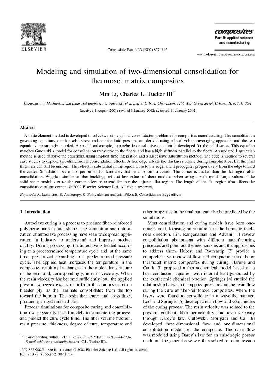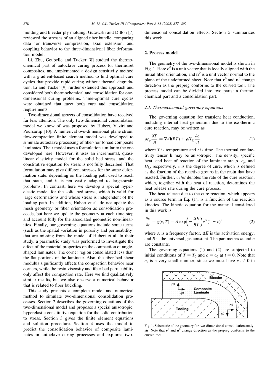 本研究提出了一种模拟二维固化过程的完整模型和数值方法。第二部分描述了二维模型的控制方程,并提出了一个特殊的各向异性、超弹性本构方程,用于确定固体对应力的贡献。第3节给出了有限元方程和求解过程。第四部分利用该模型预测了复合层压板在热压成型过程中的固化行为,并探讨了二维固化效应。第5节总结了这项工作。